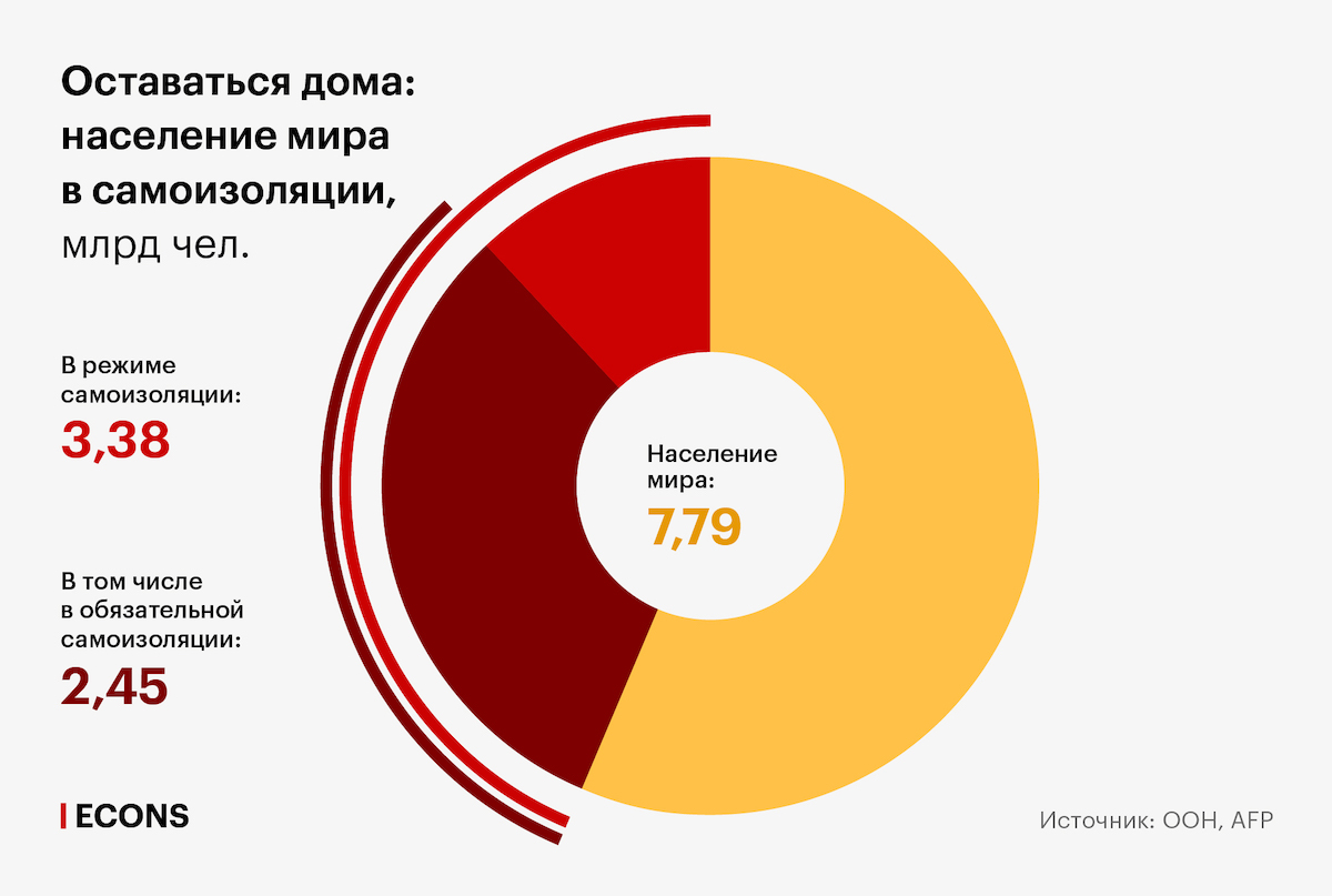 Россияне не одиноки — к 30 марта под карантином той или иной строгости по всему миру находятся 3,4 млрд человек в почти 80 странах — это более 40% глобального населения.
