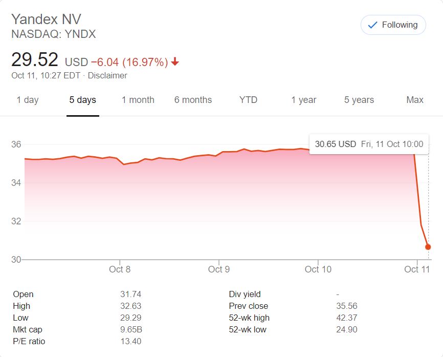 После открытия торгов на американской Nasdaq акции «Яндекса» рухнули на 17% из-за новостей о том, что Госдума может рассмотреть законопроект о значимых интернет-ресурсах уже в ноябре. Капитализация компании упала примерно на $1,5 млрд — сейчас «Яндекс» стоит меньше $10 млрд.