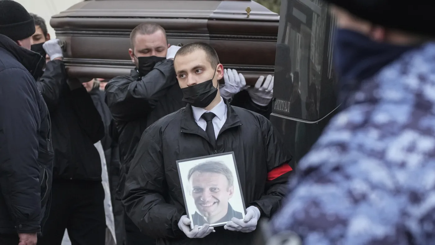 Гроб с телом Алексея Навального несут сотрудники похоронной службы. Накануне похорон соратники политика заявили, что в Москве ритуальным службам отдан приказ не работать на похоронах Навального. Они с трудом нашли катафалк, а выдачи тела из морга в Подмосковье семье политика в день похорон пришлось ждать больше двух часов.
