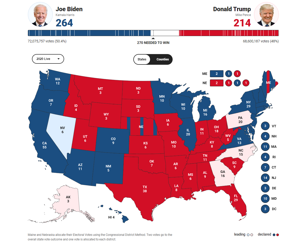 С учетом Мичигана Джо Байден получает 264 голоса выборщиков. Таким образом, для победы ему остается набрать лишь 6 голосов. Их может обеспечить Невада, в которой вчера вечером приостановился подсчет голосов. Он возобновится во второй половине дня. Пока Байден ведет там с небольшим перевесом — 49,3% на 48,7%, посчитано 75% голосов.