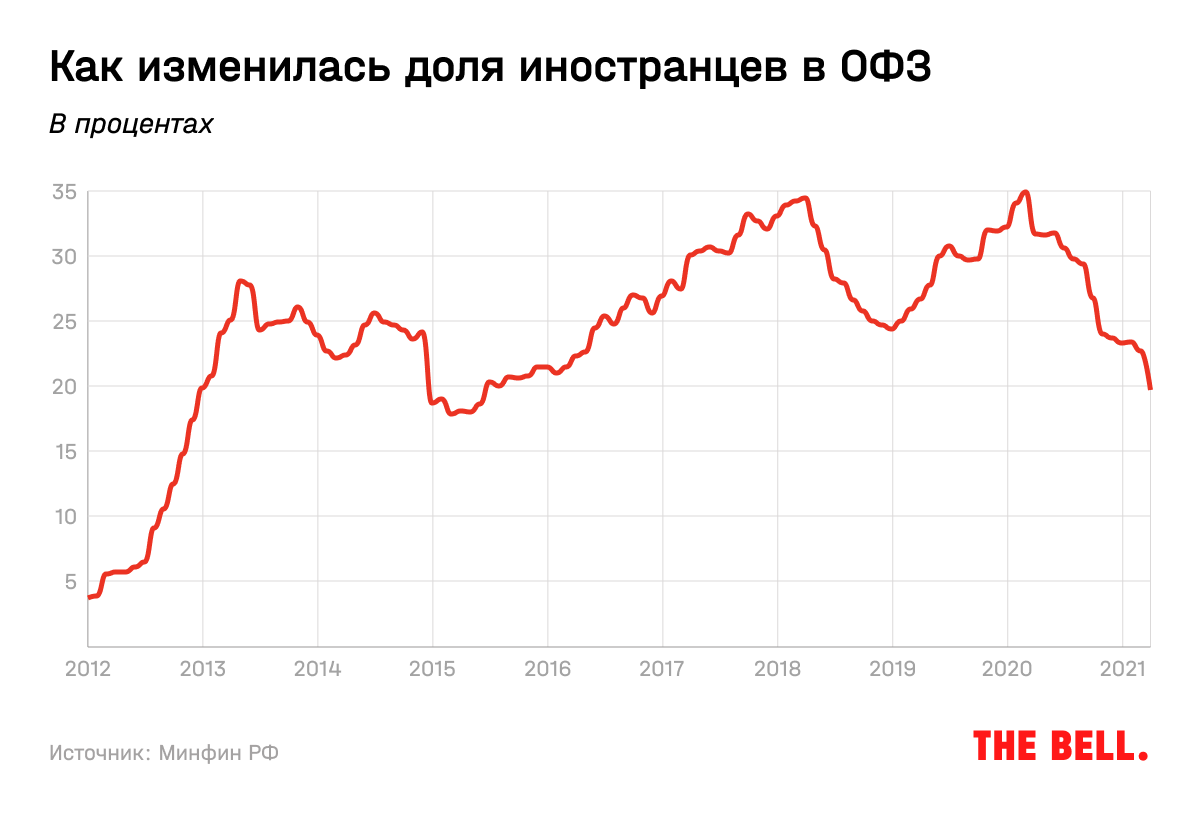 В 2021 году Минфин планировал разместить бумаги на 2,9 трлн рублей, в том числе около 1 трлн рублей во втором квартале, следует из ежемесячных отчетов ведомства об исполнении федерального бюджета. На первый квартал было запланировано примерно столько же, разместили меньше — 740 млрд рублей. План на 2021 год выполнен более чем на 25%, то есть в этом году из-за иностранцев «не хватит» около 200–220 млрд рублей, рассчитал Салихов по просьбе The Bell. Это некритичный объем, который можно заместить из других источников — например, за счет нефтегазовых доходов, говорит он. В экстренном сценарии эти бумаги всегда может купить ЦБ, уверена главный экономист Альфа-банка Наталия Орлова. Для понимания порядка цифр, в рамках бюджетного правила Минфин в апреле 2021 года планирует купить валюту на 185,7 млрд рублей, отмечает руководитель центра инвестиционного анализа и макроэкономических исследований ЦСР Даниил Наметкин.