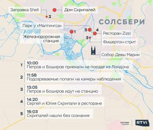 - Боширов с Петровым рассказывают в интервью, что в Солсбери отправились именно для осмотра достопримечательностей. «Друзья нам давно уже советовали посетить этот прекрасный город», — говорит Петров. Боширов добавляет, что это «туристический город», и рассказывает о Солсберийском соборе с его 123-метровым шпилем и «самыми первыми в мире часами».