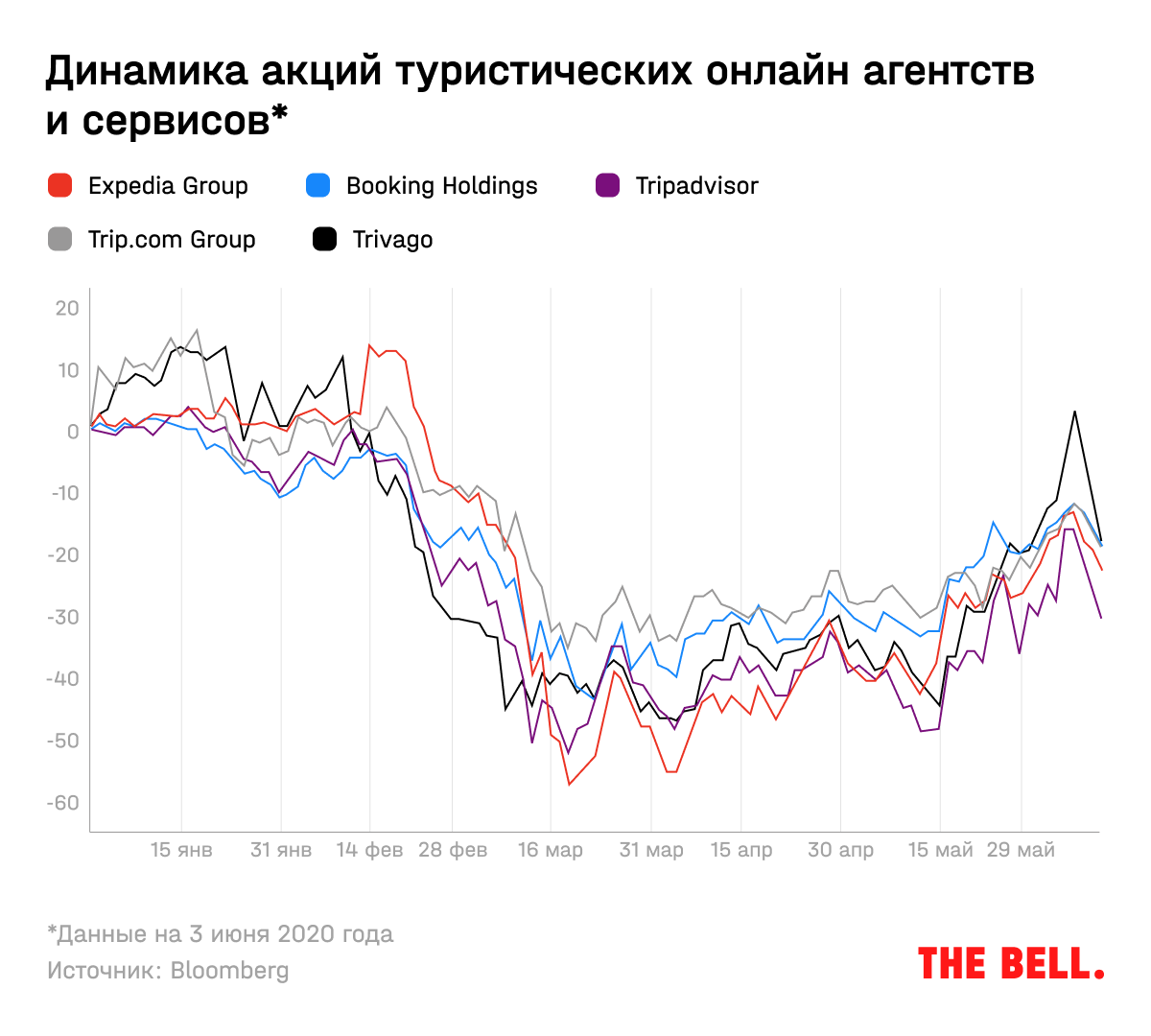 Туристическая индустрия оказалась одной из наиболее пострадавших во время пандемии: за апрель 2020 года выручка онлайн-агентств упала более чем в два раза. В результате акции крупнейших игроков индустрии упали до многолетних минимумов. Падение у лидеров рынка с максимальных значений января до дна в марте 2020 года составило: