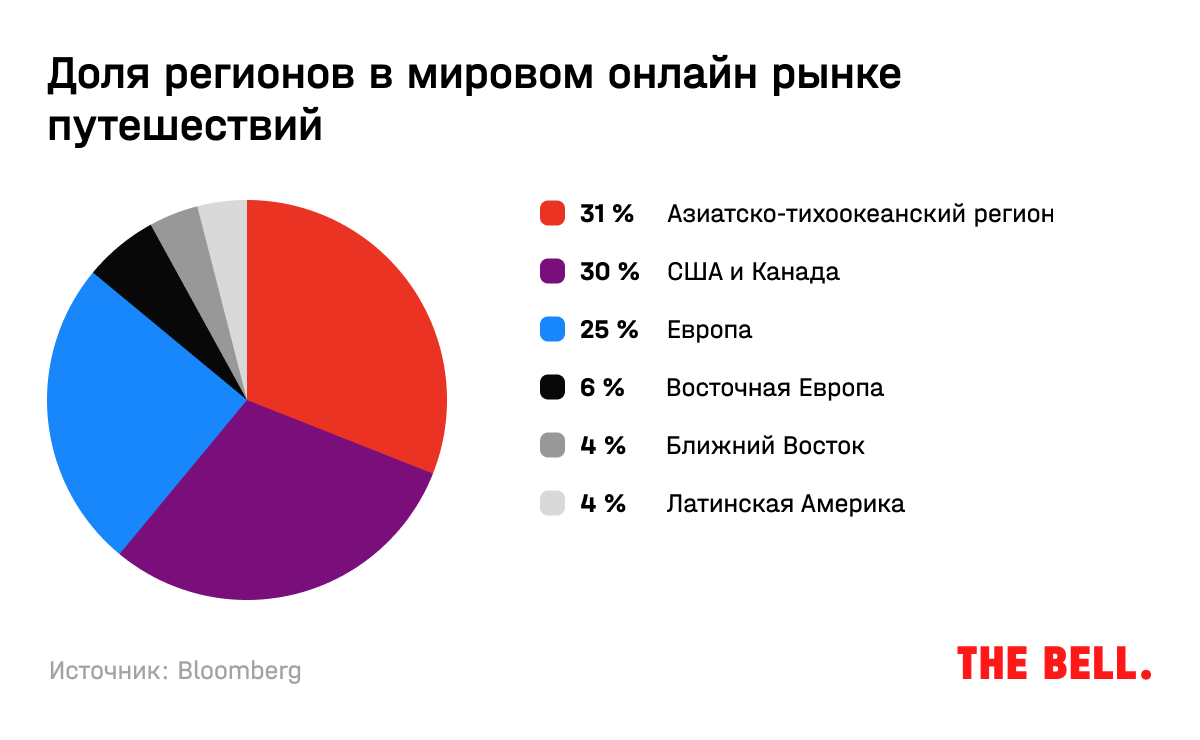 Стоит отметить, что Азиатско-Тихоокеанский регион перегнал Северную Америку как самый крупный покупатель онлайн-путешествий. Свою роль сыграл относительно недавний рост уровня жизни населения в этих странах, что привело к большому скачку рынка путешествий в онлайн-сегменте, минуя фазу развития, аналогичную развитым странам второй половины XX века.