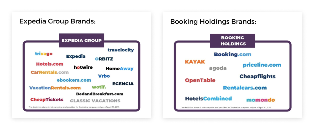 Каждая из этих компаний обладает портфелем разных сервисов и приложений онлайн-бронирования в разных сферах (авиабилеты, отели, экскурсии, аренда автомобилей и т.п.) и может предоставлять клиентам комбинированные услуги. Пример Expedia Group и Booking Holdings: под вывеской одной компании собраны несколько поисковых систем. Аналогичным образом устроена и структура других онлайн-агентств.