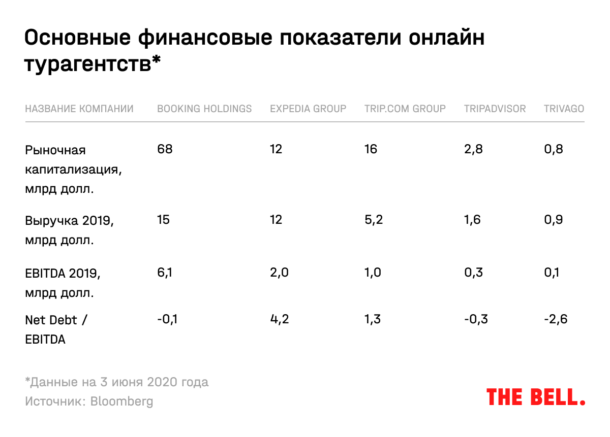 Команда Borsell Research рассмотрела пять крупнейших международных компаний: четыре западные — Booking Holdings, Expedia Group, Trivago, TripAdvisor — и одну китайскую — Trip.com Group. Для выявления наиболее устойчивого игрока к сложившейся ситуации мы сравнили их по ряду оценочных мультипликаторов и уровню долговой нагрузки. Акции некоторых крупных компаний не включены в обзор ввиду низкой доли онлайн-путешествий в общем обороте (Alphabet, Meintuan Group, Alibaba, Jinjiang и HNA) или отсутствия публично торгуемых акций (Airbnb, IPO компании, вероятно, произойдет в 2021 году).