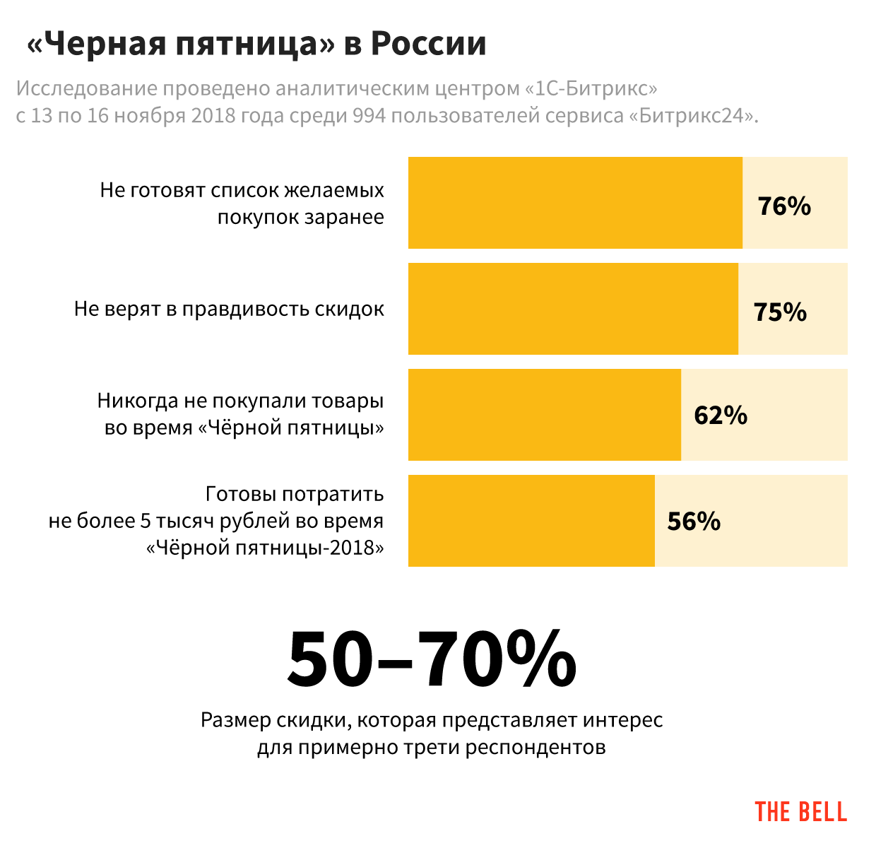 - Минимальный размер скидки на BlackFridaySale составил 15%, а максимальный — 90%. У «Настоящей черной пятницы» — 7% и 90%.