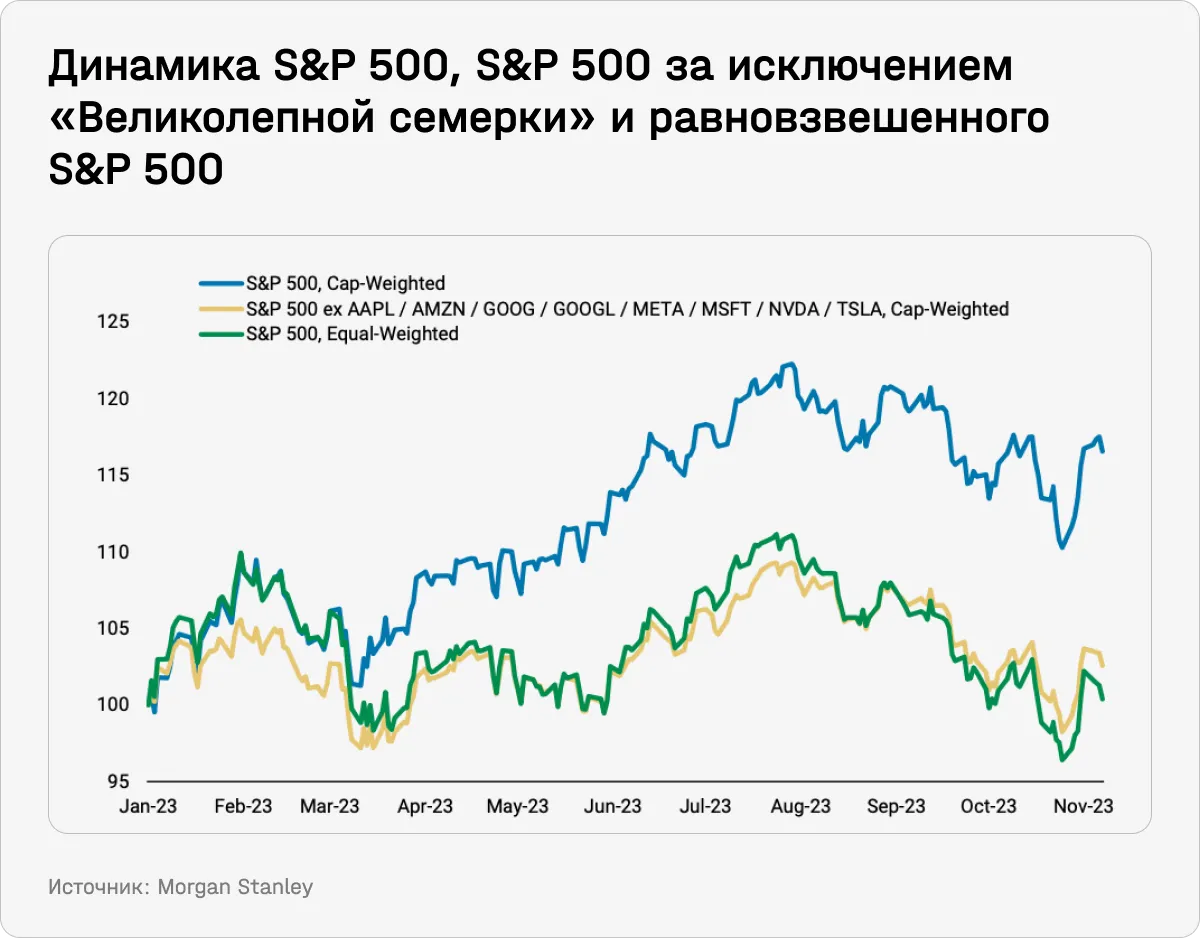 По мнению аналитиков Morgan Stanley (MS), это говорит о том, что текущий рост «нездоровый», и узость рынка сохранится и в начале 2024-го — до тех пор, пока не начнется широкомасштабное восстановление прибылей (подробнее о разных сценариях — ниже).