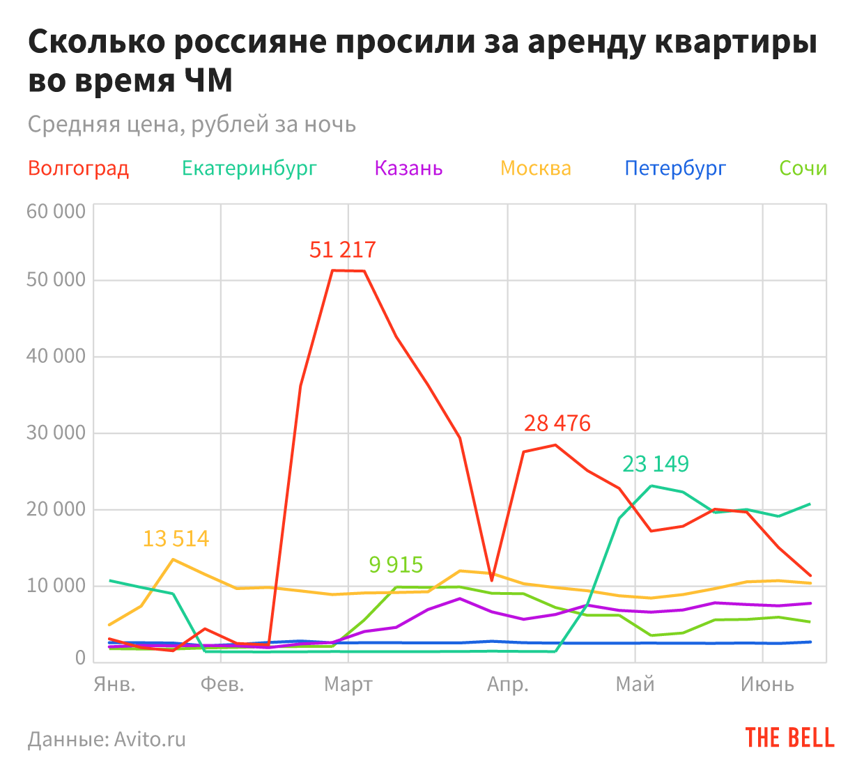 - Точных оценок, сколько на всех этих людях заработает гостиничный бизнес, нет, а ресторанный, по оценке РБК, заработает 13 млрд рублей. Еще труднее оценить, сколько денег заработают россияне на сдаче квартир, о подорожании которых СМИ пишут с начала года. Но из статистики сервиса объявлений Avito можно сделать вывод: больше всего по сравнению с обычным сезоном в дни чемпионата заработают жители региональных городов. В Волгограде средняя цена посуточной аренды квартир на время чемпионата за полгода выросла в 5 раз, в Самаре — в 4,5, в Казани и Сочи — в 3,5 раза. В крупнейших городах все не так резко — в Москве цена выросла в 2 раза, а в популярном у туристов круглый год Санкт-Петербурге — вообще не изменилась. При этом из графика видно, что весной арендодатели (особенно почему-то в Волгограде) рассчитывали на большее, а к июню спрос вынудил их умерить аппетиты.