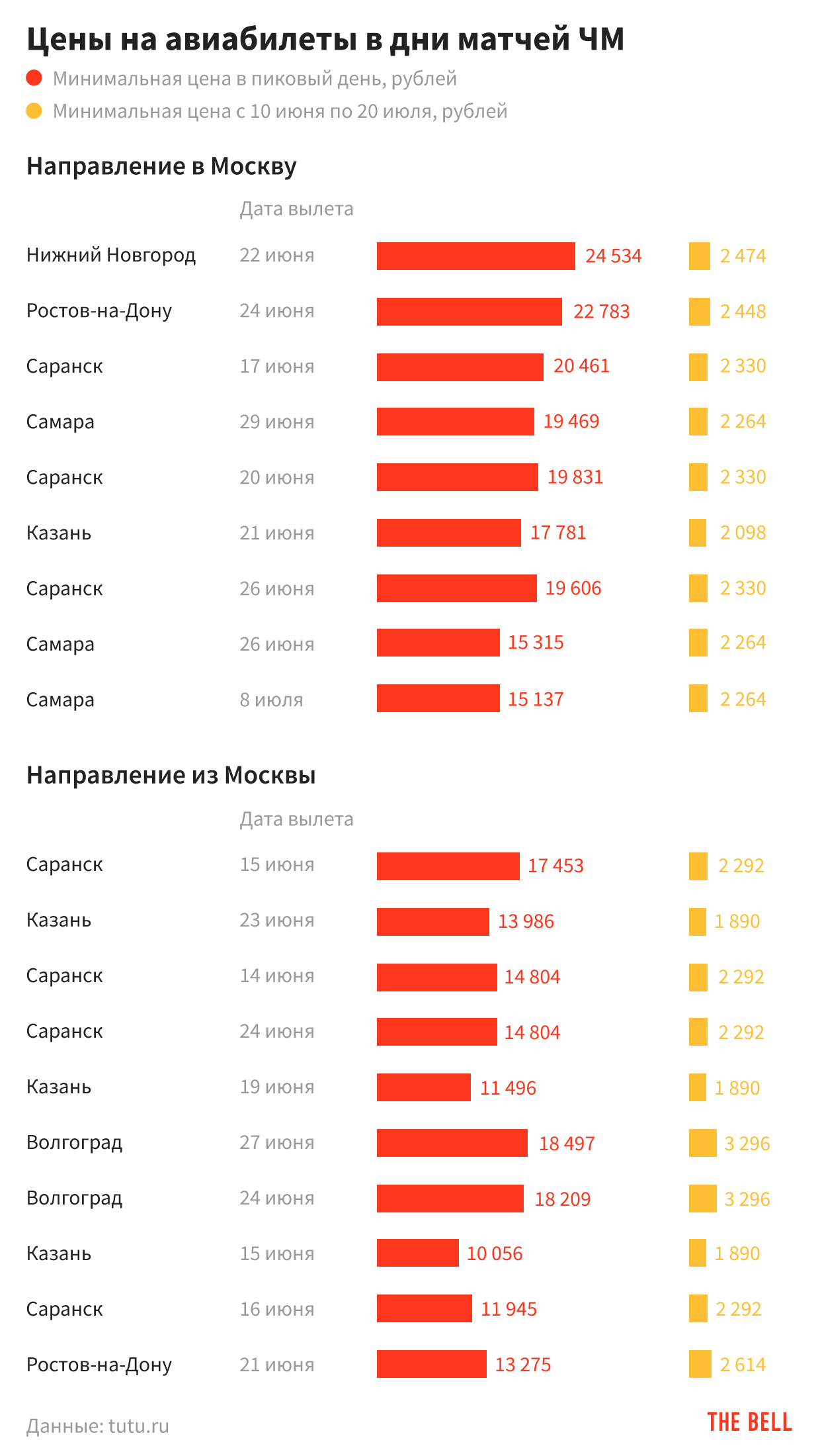 - Еще одними бенецифиарами чемпионата, хотя бы за счет роста пассажиропотока, станут авиакомпании. Государство всячески стимулировало их не повышать цены, и в результате билеты в среднем подорожали не так сильно — но билеты в города ЧМ в дни матчей, по подсчетам компании Tutu.ru, все равно подорожали в разы.