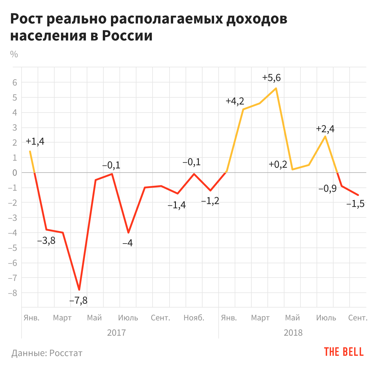 - Резкие колебания курса рубля не прошли даром — реальные располагаемые доходы россиян от долгожданного роста в начале года вернулись к падению. В августе они упали на 0,9%, в сентябре — уже на 1,5%. Падение доходов при росте зарплат (+7,2%) экономисты объясняют ростом инфляции, закредитованности, падением доходов от предпринимательства и тем, что население начало забирать деньги с валютных счетов, обналичивать и перекладывать в банковские ячейки. Все это — на фоне резкого снижения потребительских ожиданий россиян, которое экономист Михаил Дмитриев в разговоре с Bloomberg называет ощущением «долгосрочной безнадежности».