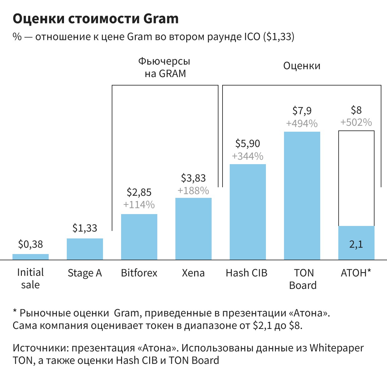 - По словам опрошенных The Bell инвесторов TON, требовать возврата денег или продавать Gram в убыток никто не собирается. Из событий последней недели следует, что у Telegram и TON есть тактика, кроме того, долгосрочные планы компании рассчитаны на 10 лет, говорит один из них. Цена Gram абсолютно непредсказуема, но многие рассчитывают, что в случае выхода на открытый рынок она останется примерно такой же, как они рассчитывали, — $2–4.