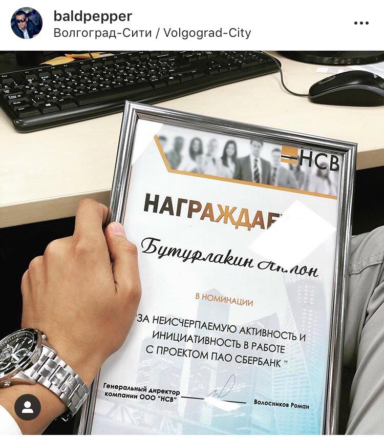 Нареканий к нему по работе, по всей видимости, не было: 2 августа Бутурлакин выложил в свой Instagram почетную грамоту за подписью гендиректора НСВ Романа Волосникова. Ею Бутурлакина наградили за «неисчерпаемую активность в работе с проектом ПАО Сбербанк». Еще одна почетная грамота от НСВ появилась на странице у Бутурлакина в декабре 2016 года. Он часто выкладывал фотографии с рабочего места, а его коллеги отмечали Бутурлакина на совместных фотографиях с корпоративов.