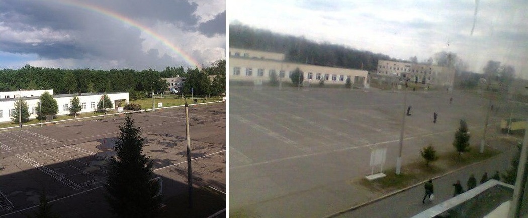 Слева — фото из аккаунта Максима Г...ва от 17 июня 2014 года. Подпись: «Радуга ну и вид из окна казармы!)))». Справа — фото плаца в/ч 32406 в Курске, где дислоцирована 53-я зенитно-ракетная бригада, из паблика военнослужащих бригады «ВКонтакте».