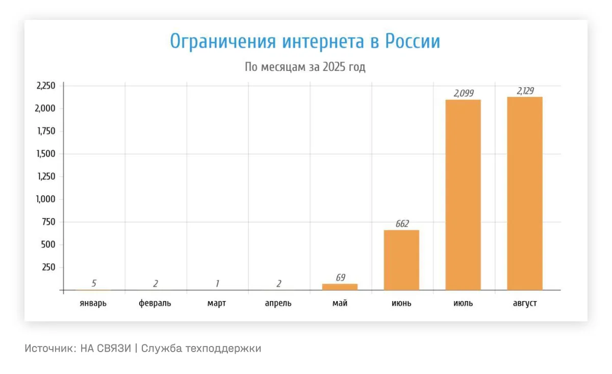 «У меня ощущение, что мы просто живем без мобильного интернета. Я уже не жду уведомлений на улице, всегда беру наличку, в приложения даже не заглядываю», — рассказывает собеседник The Bell в одном из российских регионов. За лето практика отключений мобильного интернета настолько плотно вошла в обиход, что теперь трудно поверить, что еще недавно шатдауны были ЧП. Для сравнения: в апреле по всей России было зафиксировано 2 случая отключения мобильного интернета, в мае их было 69, а в августе — уже 2129, подсчитывал проект «На связи» (анализирует жалобы пользователей и проверяет их техническими средствами).