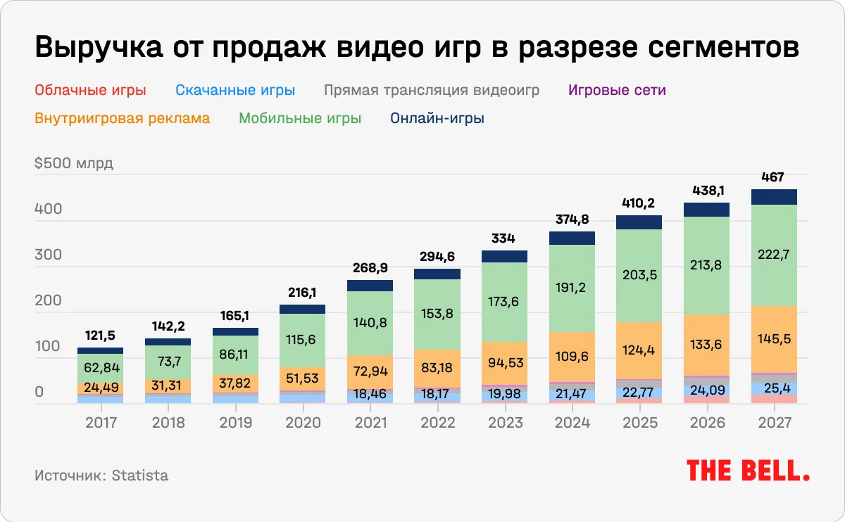 Большую часть выручки от видеоигр (52%) приносят мобильные игры ($153,8 млрд в 2022-м). Они же будут главным драйвером роста всего рынка. Именно от этого сегмента во многом зависят компании, о которых идет речь ниже.