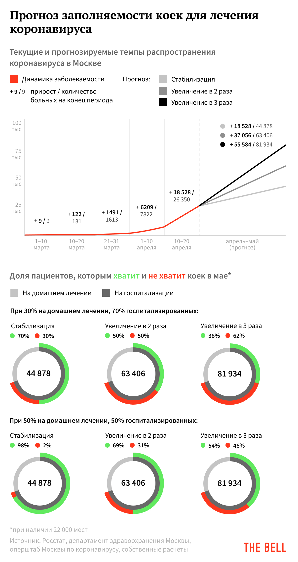 Из расчетов The Bell выходит, что на 20-е числа апреля перепрофилированные под коронавирус больницы в Москве были почти заполнены. Еще на прошлой неделе депздрав и сам признавал, что в ближайшие две-три недели в Москве возможен дефицит коек. О том же говорили и некоторые главврачи, например, в больнице им. Филатова сообщали о 1,5 тыс. пациентов при максимуме в 1,3 тыс. мест.