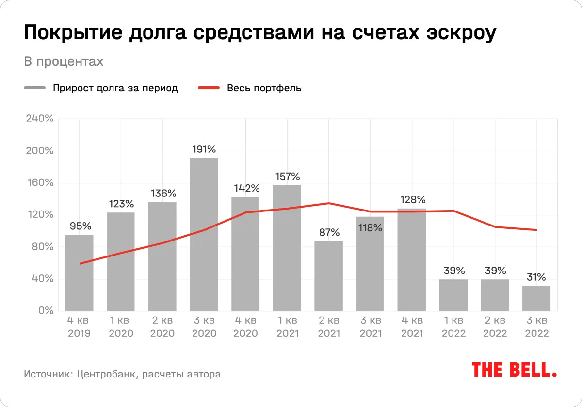 Лучше всего ситуацию с проектным финансированием показывает график с покрытием долга средствами на счетах эскроу. Как видно из уровней покрытия, выданные кредиты были с запасом покрыты эскроу, но с начала «спецоперации» ситуация резко изменилась: рост долгового портфеля опережает рост портфеля эскроу в 3–4 раза последние четыре месяца.