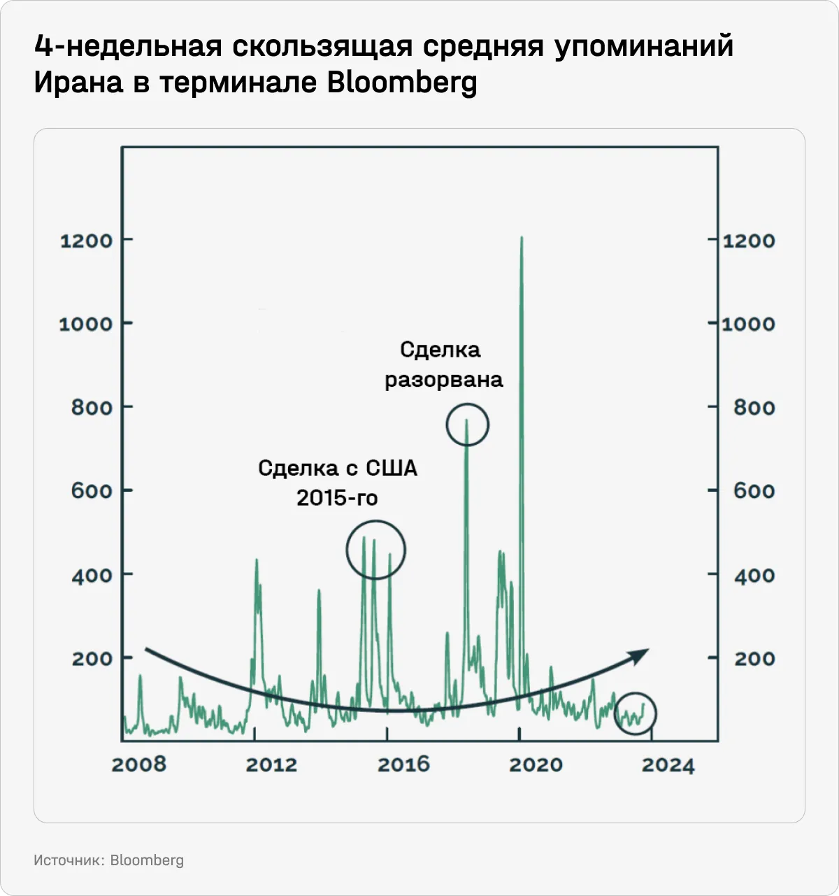 Но и на риски, связанные напрямую с Ираном, рынки с 2020-го обращали все меньше внимания. На графике ниже — количество историй, упоминающих иранскую пробематику, в терминале Bloomberg.