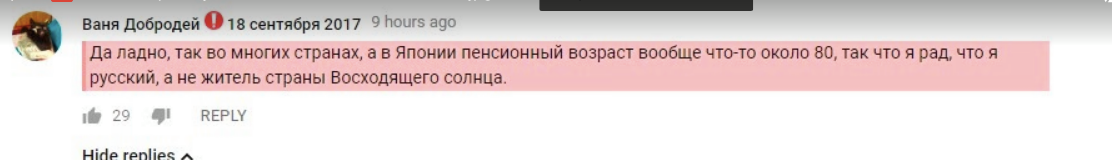 - Основные тезисы комментариев троллей в Youtube совпадают с доводами правительства: реформа необходима, она позволит повысить пенсии, а людям в возрасте станет проще найти работу, во всем мире возраст выхода на пенсию выше, чем в России, а оппозиционеры и либералы разводят панику, перечисляет Смолин.