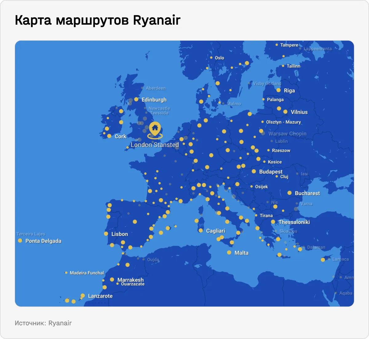 Ryanair — это авиакомпания-лоукостер, которая организует регулярные пассажирские авиаперевозки в 36 странах (Европы и Северной Африке). Она была основана в 1984 году, а ее головной офис находится в Сордсе, Ирландия. Ryanair осуществляет более 3,2 тысячи ближнемагистральных рейсов в день и обслуживает 228 аэропортов.