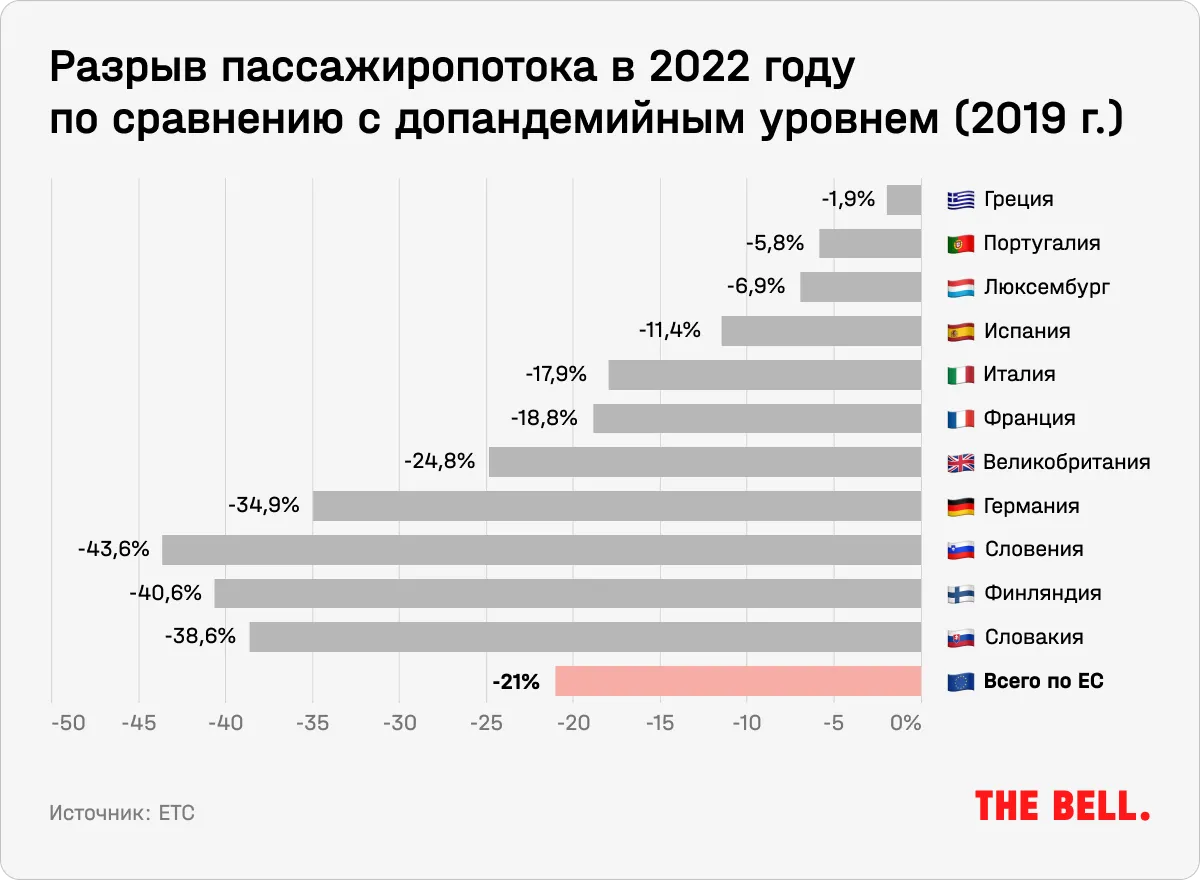 Несмотря на рекордный прирост, величина пассажиропотока в ЕС не восстановилась полностью, показатель остается на 21% ниже допандемийного уровня. По итогам 2022 года только 27% аэропортов ЕС приблизились к уровням 2019 года. Среди них оказались аэропорты Греции, Португалии и Люксембурга. Однако крупнейшие рынки показывают более слабые результаты.