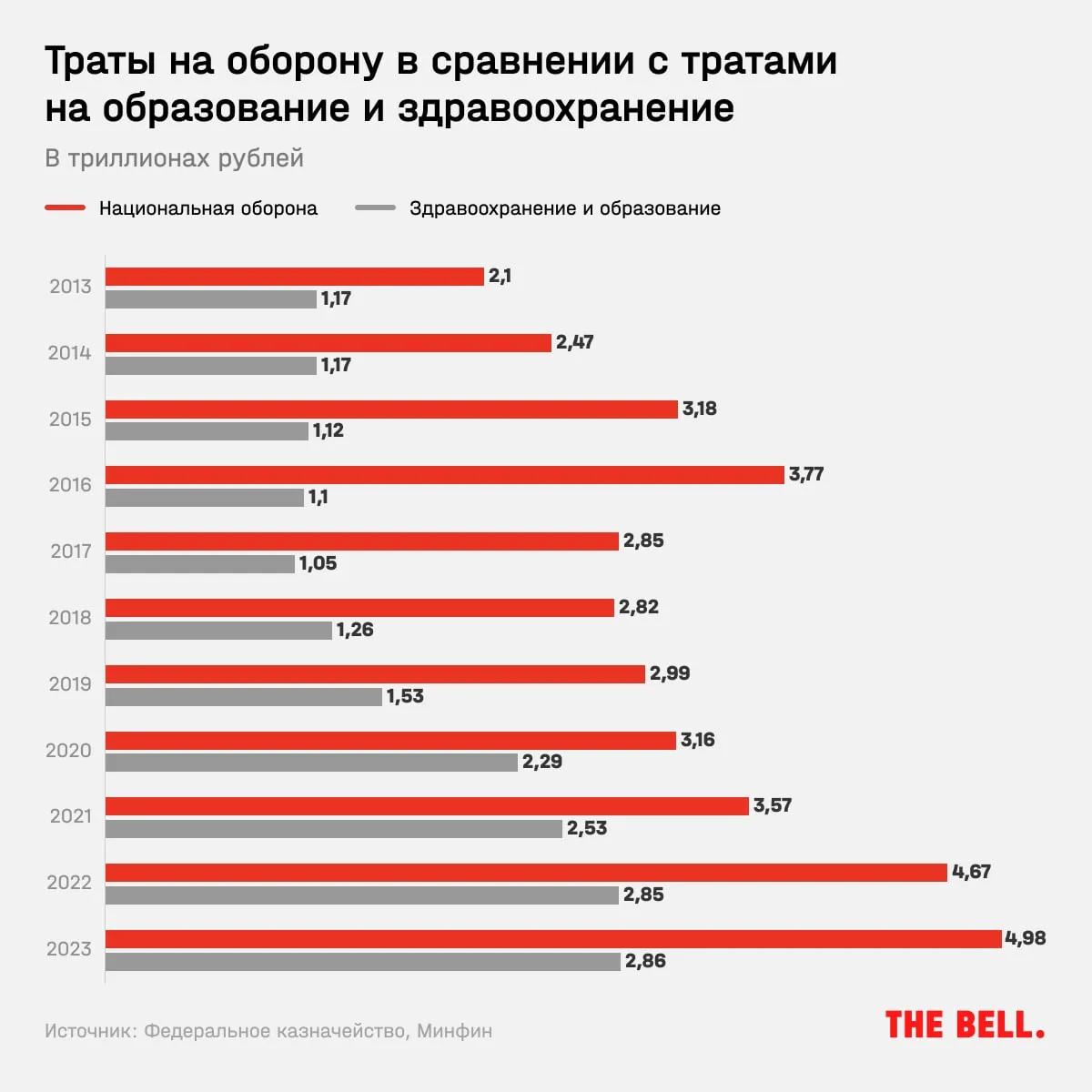 Доля трат на национальную оборону в федеральном бюджете ежегодно составляет до 14% до 23% — это больше, чем траты на здравоохранение и образование вместе взятые.