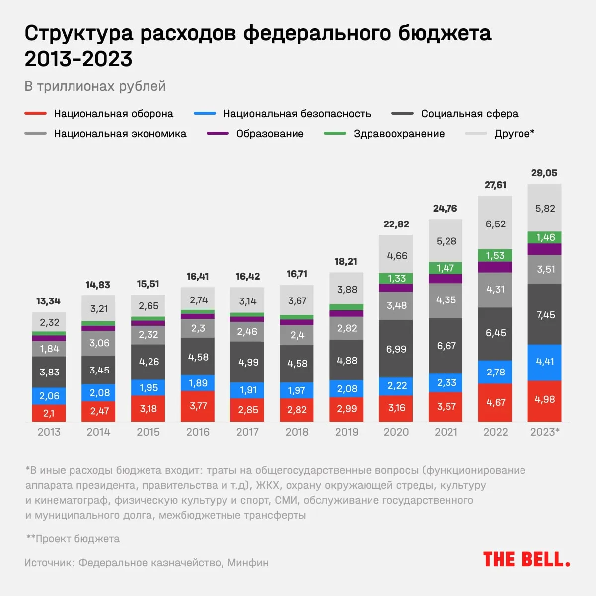 На графиках можно увидеть максимальный разрыв между расходами на оборону и соцсферу (более чем вдвое) до 2020 года. Этому есть объяснение: из-за ковида в 2020 году расходы на здравоохранение резко выросли. Ковидом можно объяснить и стремительный рост расходов на социальную сферу — в нее были записаны траты на различные антикризисные пособия.