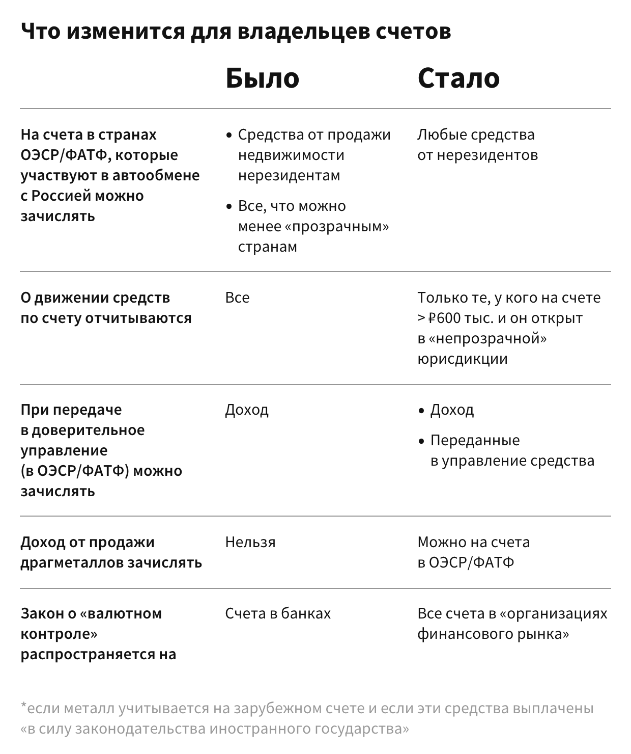 - ❗️ Доходы от продажи драгметаллов, которые учитываются на зарубежных счетах, — тоже с 2020 года, и только в случае если эти средства выплачены «в силу законодательства иностранного государства». Эта оговорка вызывает вопросы: такое требование вполне может быть не прописано в законе, а быть нормой банковской практики, говорит Грицепанова из PwC Legal.