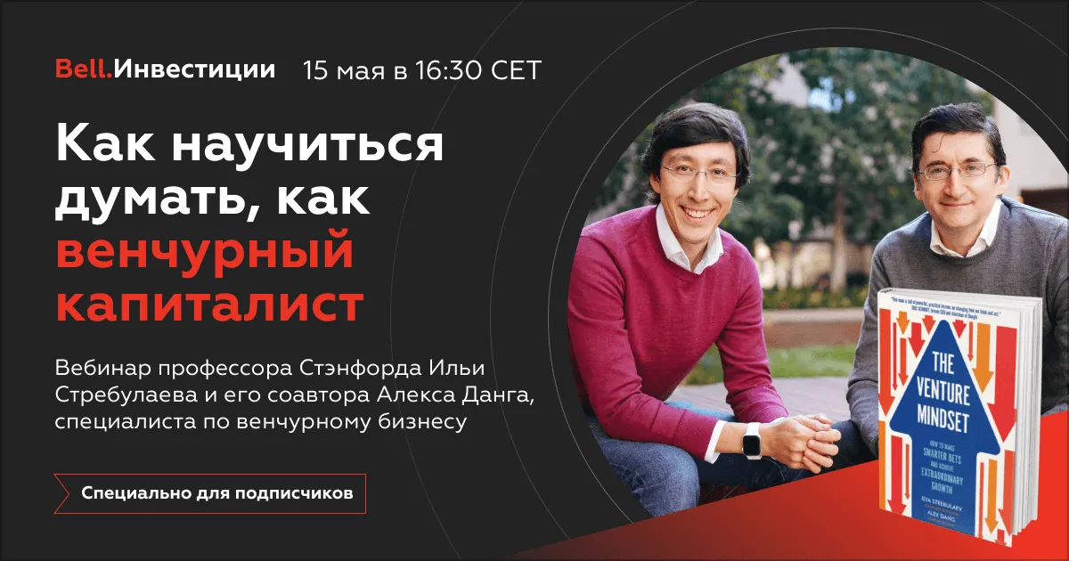 Специально для подписчиков рассылки «Bell.Инвестиции» 15 мая в 16:30 по центральноевропейскому времени (CET) профессор Стэнфорда Илья Стребулаев и его соавтор, экс-партнер McKinsey и руководитель нескольких инновационных бизнесов в Amazon, Алекс Данг проведут вебинар на русском языке, на котором расскажут о самых важных принципах венчурных капиталистов на основе самого популярного курса в Стэнфорде о венчурных инвестициях и, конечно, ответят на ваши вопросы.
