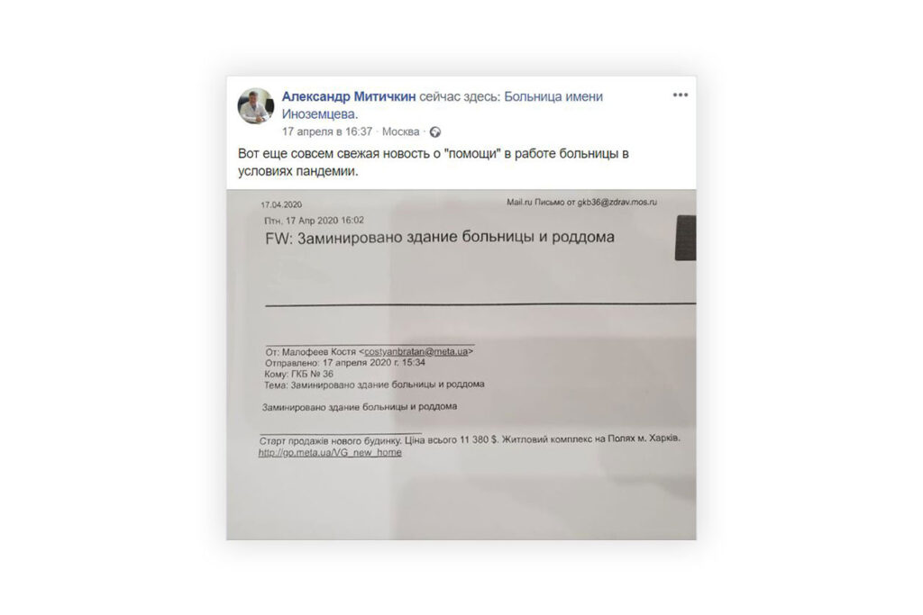 ГКБ им. Ф.И. Иноземцева. На днях сюда пришлось выезжать кинологам и минерам — из-за анонимных сообщений о минировании, которые рассылаются в крупных городах России с осени 2019 года. «Вот такая “помощь” в работе больницы в условиях пандемии», — писал ее главврач Александр Митичкин.