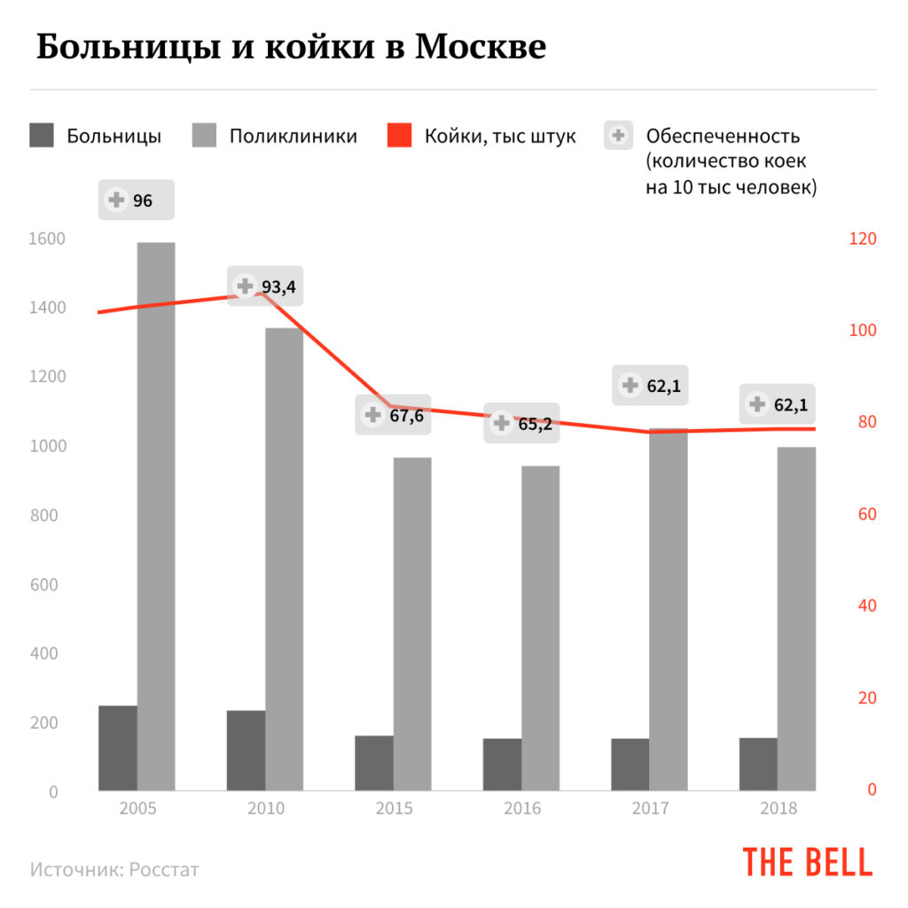 Старые больницы на протяжении многих лет закрывались или укрупнялись, а новые в тех же объемах не строились. В Москве за 2005–2018 годы число больниц сократилось на 45%. В одном только 2014 году 65 московских стационаров стали 35 юрлицами — многопрофильными центрами. Из исследования ВШЭ по результатам последней реформы следовало, что в целом по России число стационаров сократилось более чем вдвое, а средний размер больницы увеличился только на 69 коек — до 225.