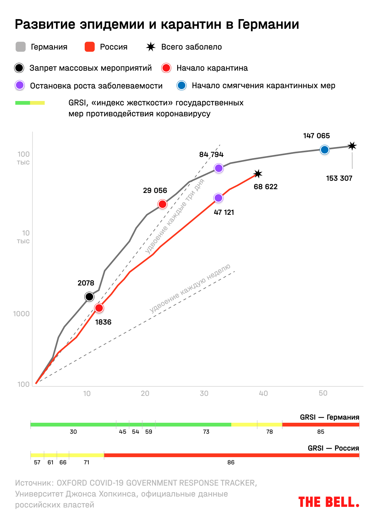 Германия считается образцовой страной по борьбе с коронавирусом в Европе, но только по уровню смертности — 5,6 тысяч умерших на 160 тысяч заболевших (пятое место в мире). Первые ограничения в Германии начали вводить через две недели после того, как число заболевших достигло 100. По оксфордским оценкам, эти меры были намного мягче российских.