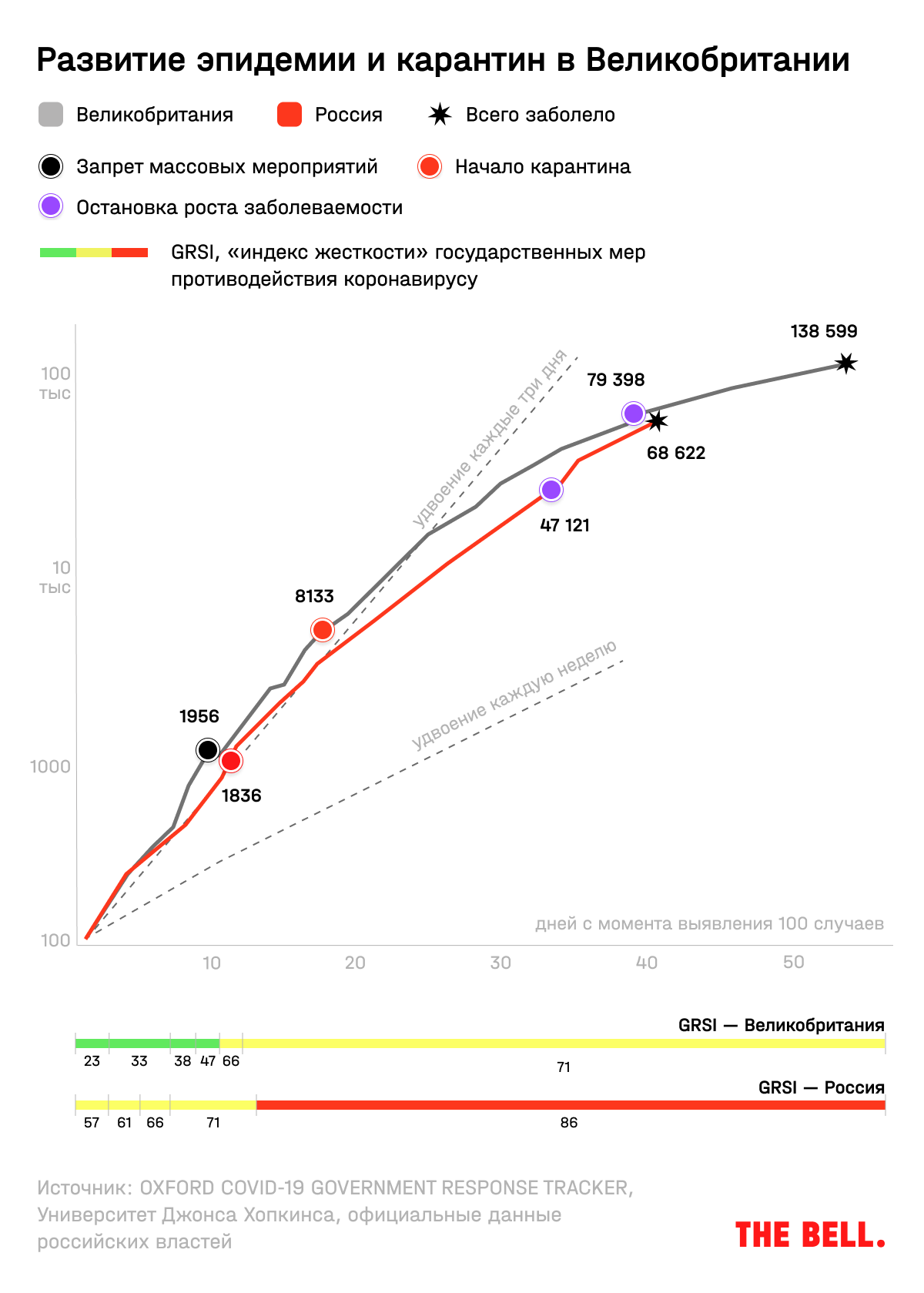 Цифры ежедневного прироста заболевших в последние пять дней в России больше всего напоминают цифры в Великобритании с 3 по 8 апреля. В Британии первые сто случаев выявили еще 5 марта, а рост ежедневного числа заболевших прекратился 10 апреля — но никакие ограничения не сняты до сих пор.