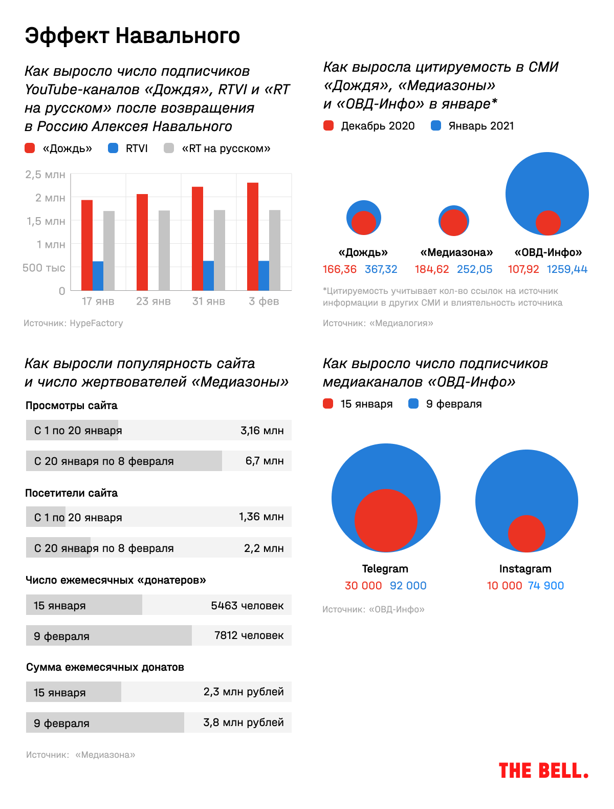 Но есть и хорошие новости. Протесты и репрессии запустили в соцсетях волну поддержки независимых медиа и активистов. Жесткая реакция властей и «эффект Навального» позволили им серьезно нарастить аудиторию и донаты. Об этом журналисты The Bell Валерия Житкова и Иван Осипов рассказали на примере телеканала «Дождь», сайта «Медиазона» и платформы «ОВД-Инфо».