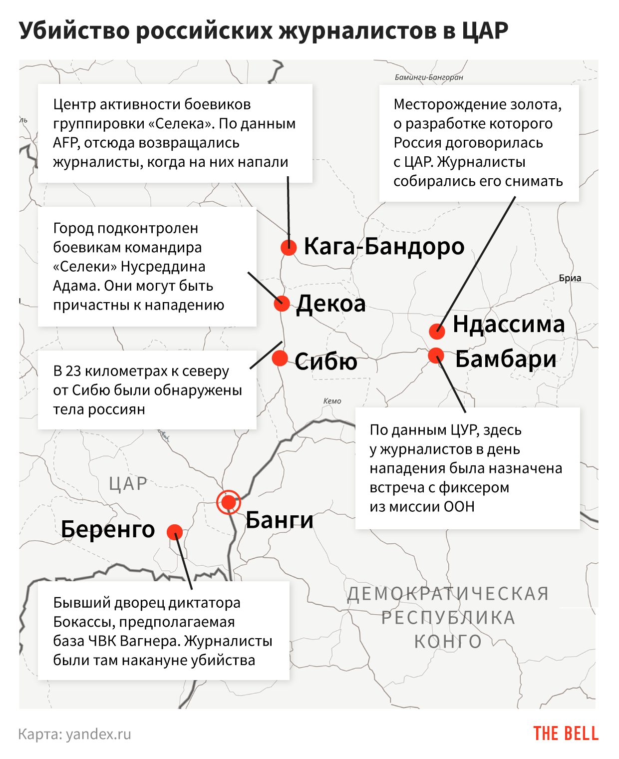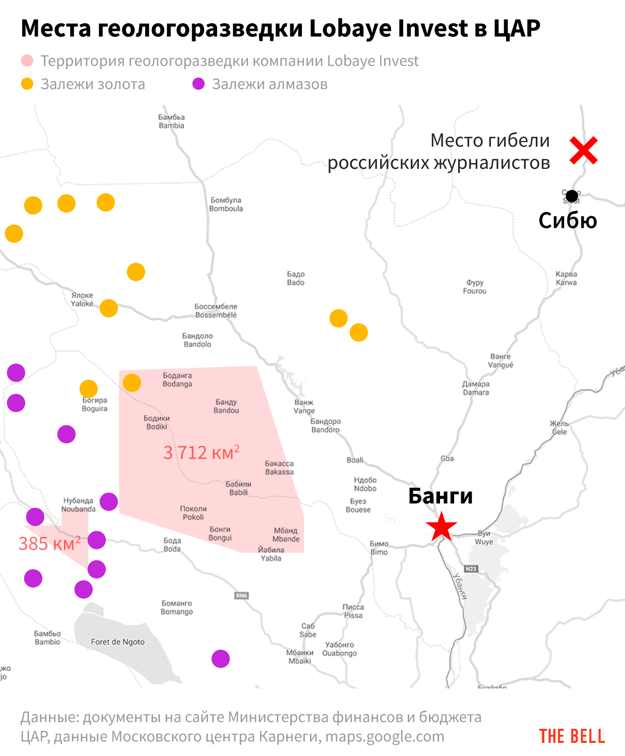 - В противоположной стороне находится месторождение Ндассима, которое, по данным издания Africa Intelligence, также контролируют (платный материал) россияне. Именно туда направлялись погибшие журналисты Орхан Джемаль, Александр Расторгуев и Кирилл Радченко. Найти документы, которые бы подтверждали, что на нем также работает Lobaye Invest, The Bell не удалось.