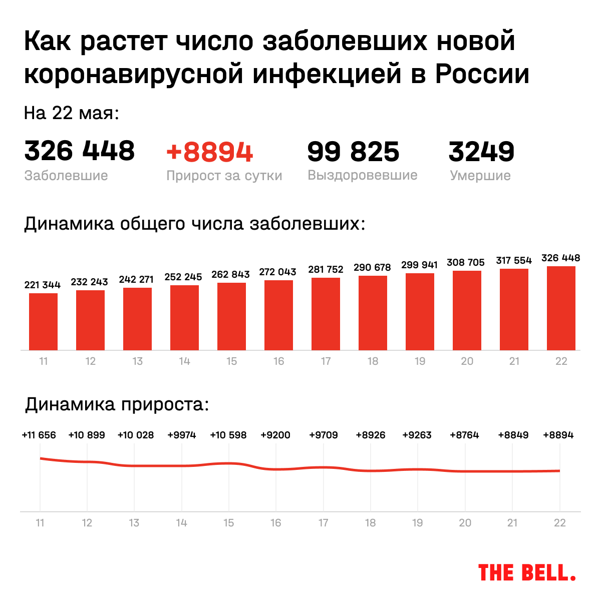 - Заразились: 326 448 человек (+8894 за сутки, 21 мая — +8849).
