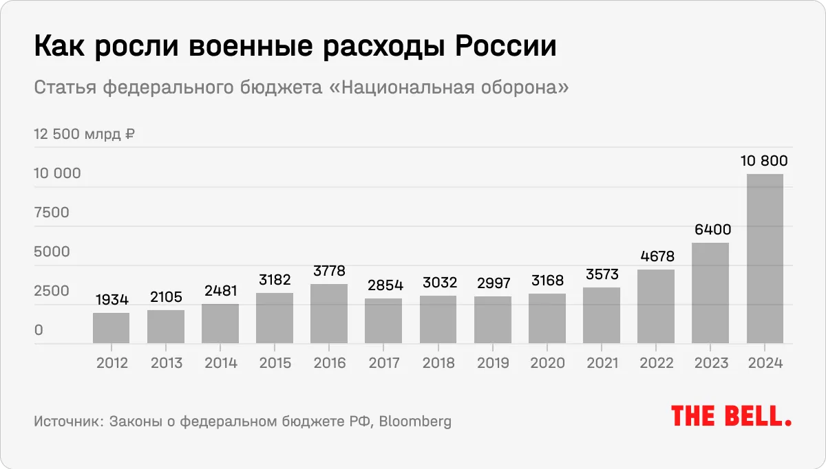 - Военные расходы (статья «Национальная оборона») в 2024 году составят 10,8 трлн рублей. Это в 1,7 раза больше, чем Россия фактически потратит на оборону в 2023-м (6,4 трлн, по данным Bloomberg), и в 2,3 раза больше, чем в первом военном 2022 году (4,7 трлн).