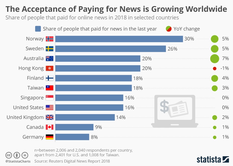 С мая на платную подписку, paywall, перешло одно из ведущих мировых деловых СМИ — агентство Bloomberg. Опыт далеко не уникальный — на основе платной подписки уже давно работают многие крупнейшие западные издания, а американские СМИ объявляют о переходе на платную модель чуть ли не каждый месяц. В России подписка пока приживается с трудом, но глобальный тренд твердо идет против желающих читать любимые СМИ бесплатно: количество людей по всему миру, готовых платить за новости и статьи, постепенно растет — хоть и медленно.