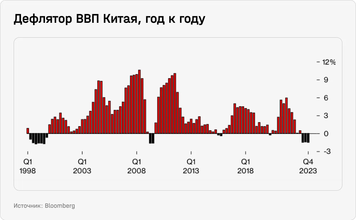 - пессимизм инвесторов, по некоторым индикаторам, достиг самого высокого уровня в истории. В январе в рекордный шестой раз подряд был зафиксирован отток из средств глобальных фондов, ориентированных на Китай. На общий сентимент влияли опасения по поводу дефляционно-долговой спирали (см. график ниже) и того, что Китай повторит судьбу Японии с ее потерянными десятилетиями. Также в числе главных рисков: проблемы на рынке недвижимости и геополитика. Многие негативные события в мире, в том числе война на Ближнем Востоке, воспринимались инвесторами через призму отношений Китая и США.