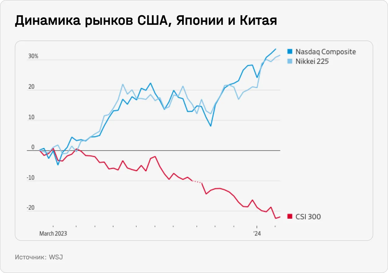 Китайский рынок — один из главных мировых аутсайдеров 2023-го и начала 2024-го. За последний год гонконгский Hang Seng снизился на 16,4%, китайский CSI 300 — на 14%, достигнув минимумов за пять лет. Особенно драматичным это падение выглядит на фоне восстановления других рынков, а также роста индекса развивающихся рынков без учета Китая.