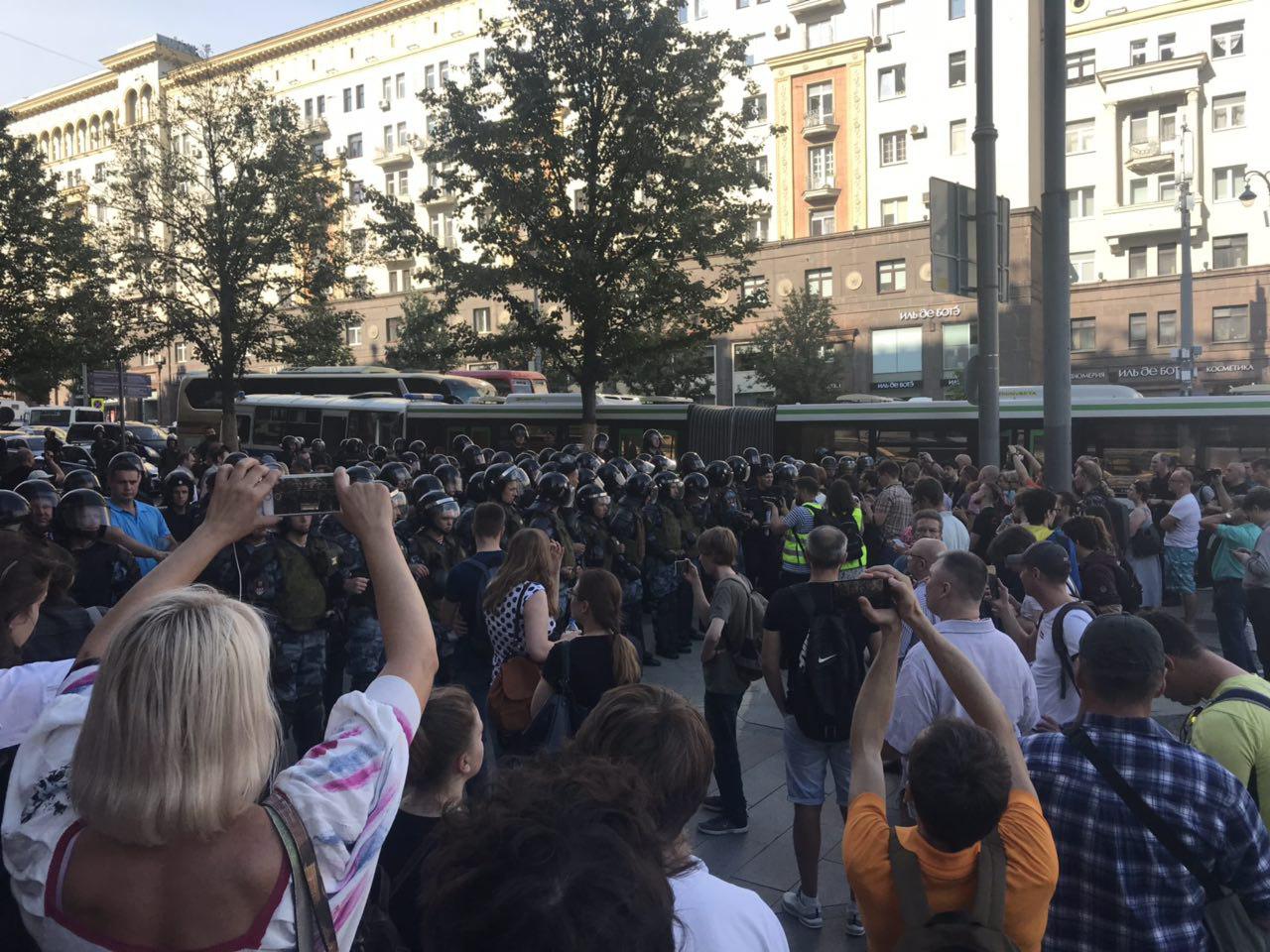 Главные события сейчас в районе памятника Юрию Долгорукому и в Столешниковом переулке, передает редактор The Bell. Сейчас, по его оценке, там находится около двух-трех тысяч митингующих. Весь переулок забит людьми, полиция оттесняет их в сторону Большой Дмитровки — в общей сложности на месте три цепи полиции, в каждой примерно по сто человек. Митингующие скандируют «пропускай!» и пытаются сопротивляться, первый ряд протестующих сцепился руками. Несколько человек полиции удалось выхватить в свои ряды и задержать. Журналистку РБК Елену Шевелеву, одетую в жилет «Пресса», грубо вытолкнули из-за оцепления, ее ударил сотрудник полиции. У нее есть аккредитация от МВД.