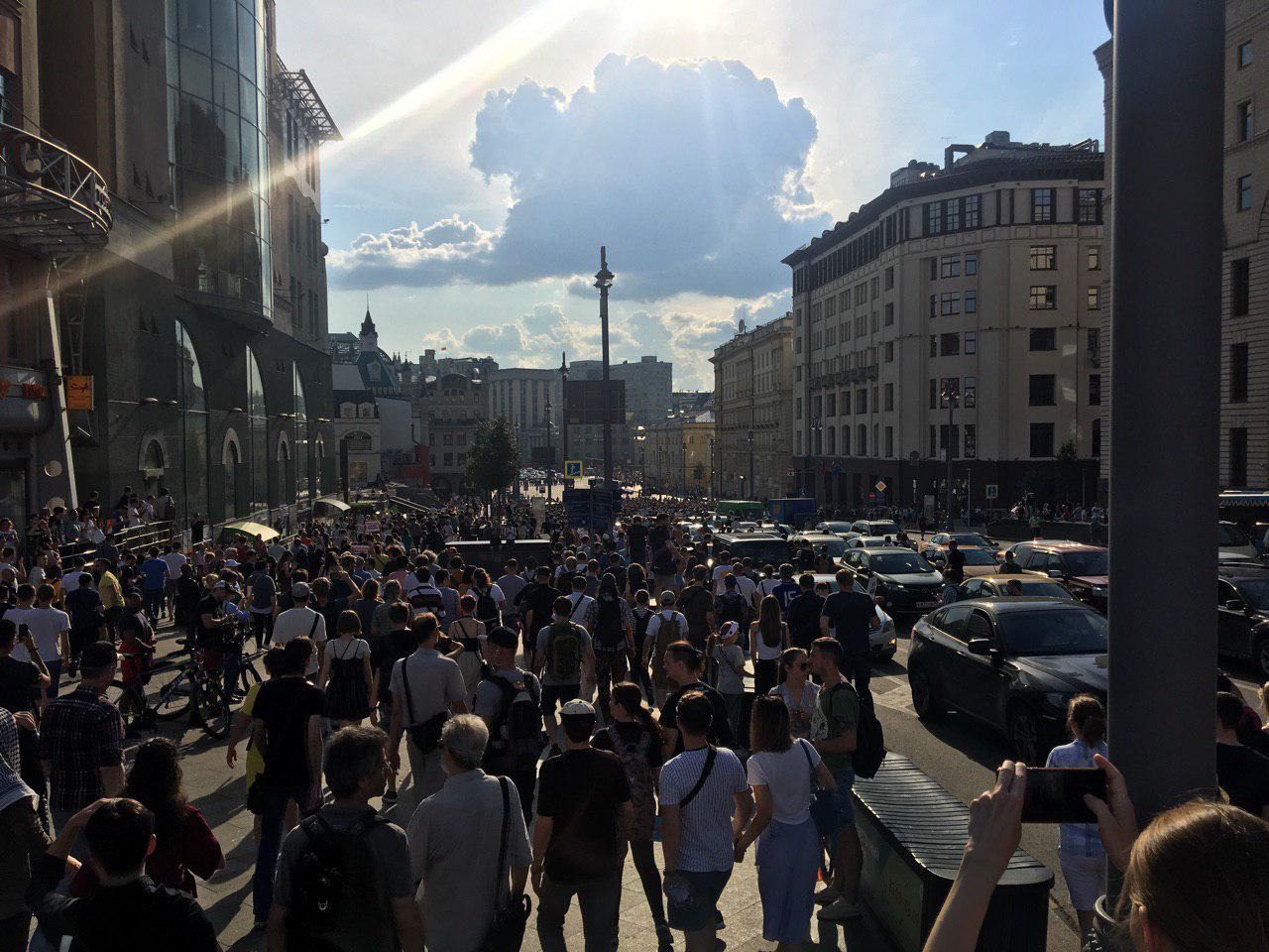 Протестующие продолжают движение — теперь в районе Моховой и Неглинной.