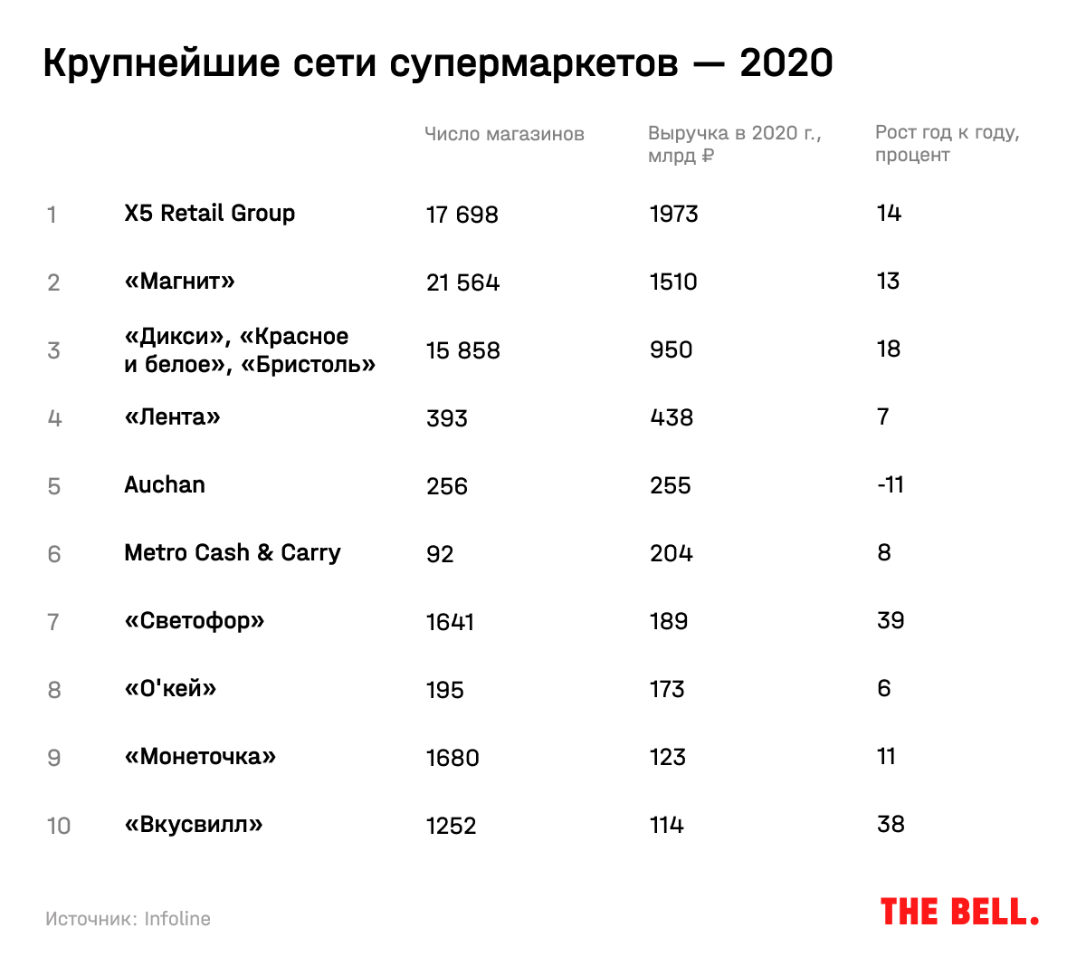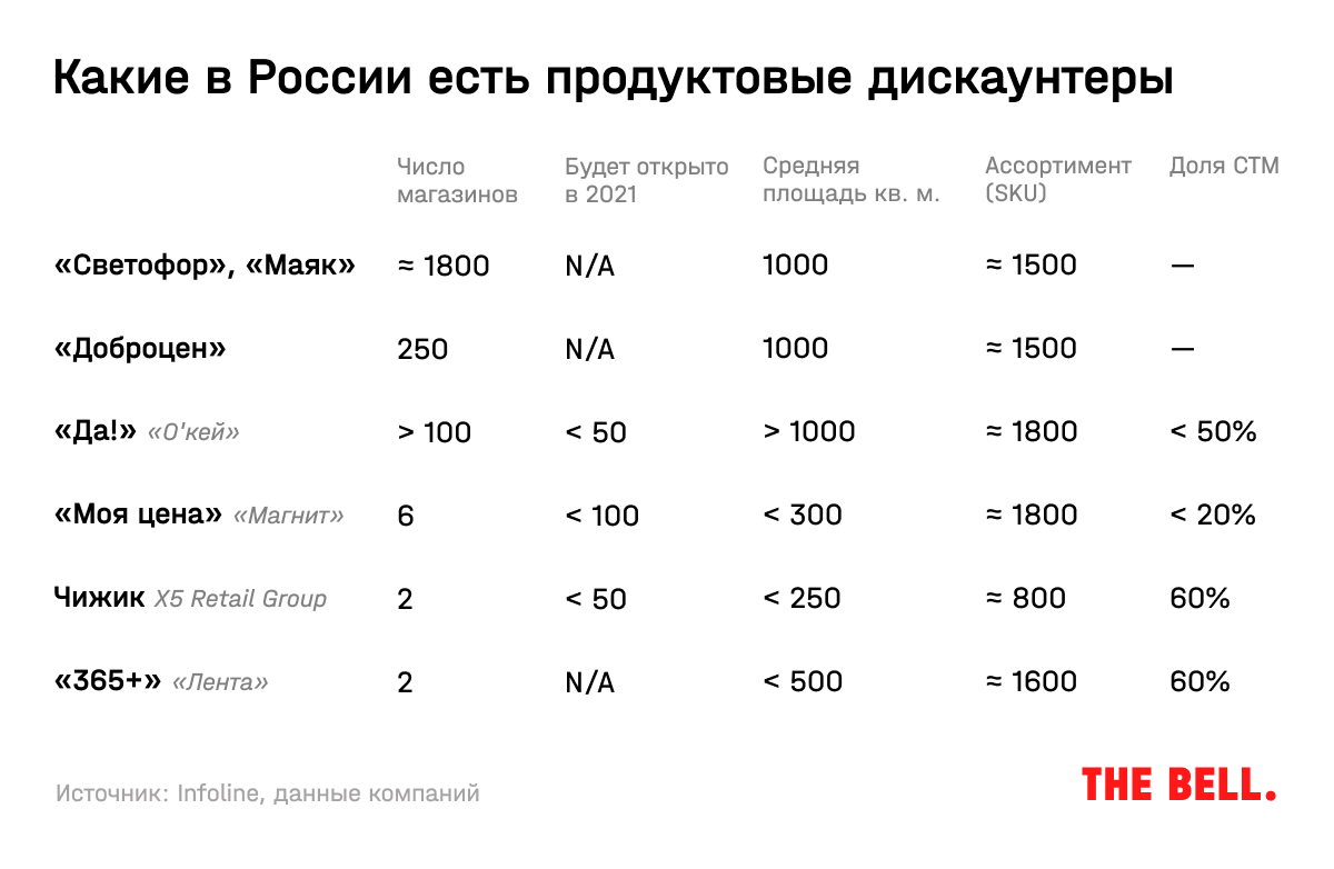По числу магазинов — более 1,7 тысячи — «Светофор» в пятерке. Примерно столько же у сети «Монетка» из Екатеринбурга. Выше только небожители: X5 Retail Group («Пятерочка», «Перекресток», «Карусель», «Чижик»), «Магнит» и объединенная компания «Дикси», «Красного и белого» и «Бристоля».