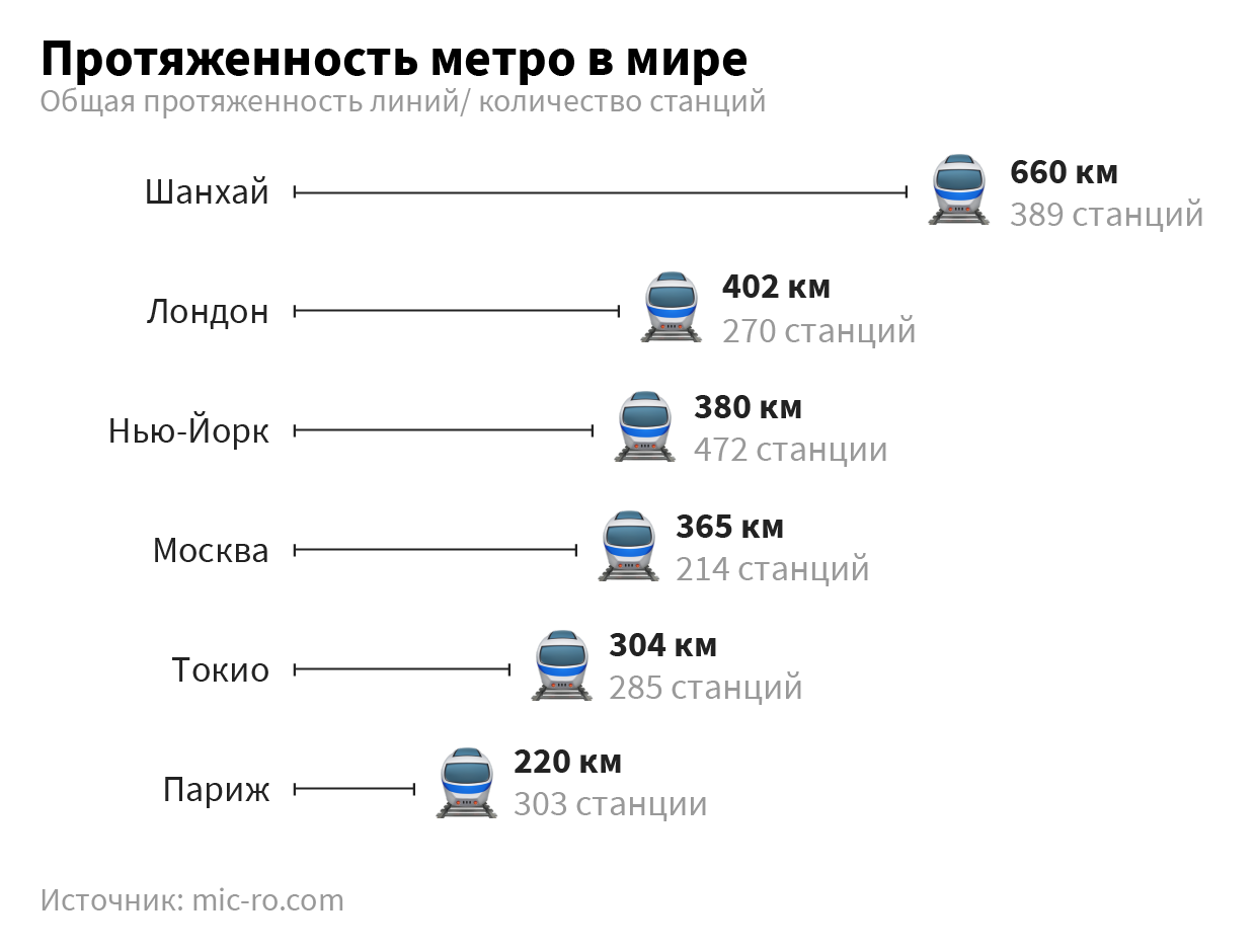- Уже сейчас московский метрополитен входит в десятку самых крупных в мире, и продолжает расти в среднем на 5 км или 2 новых станции в год.