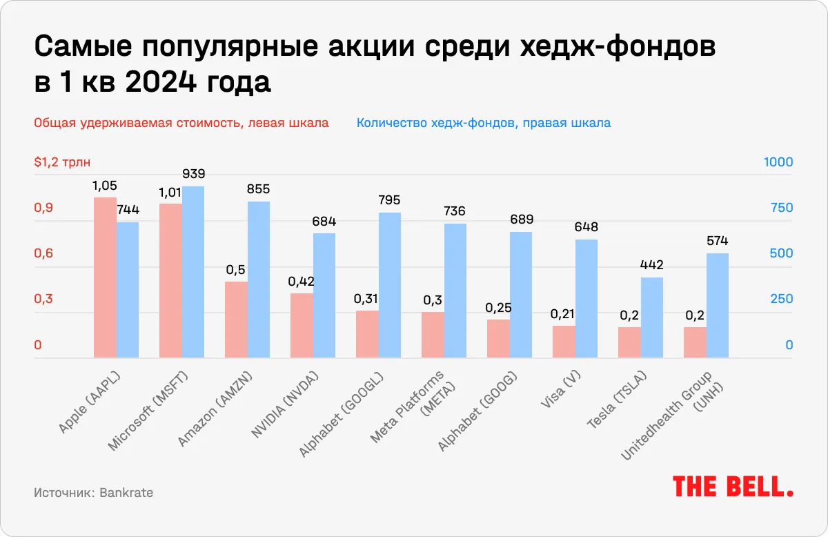 В топ-10 самых популярных компаний, ожидаемо, — «Великолепная семерка». Это логично с учетом того, что крупным инвесторам зачастую сложно найти большое число компаний для выгодных вложений (об этом много говорил Уоррен Баффетт). Явными лидерами по общей стоимости в портфелях остаются две крупнейшие компании — Apple и Microsoft, несмотря на продажи некоторыми гуру их бумаг.