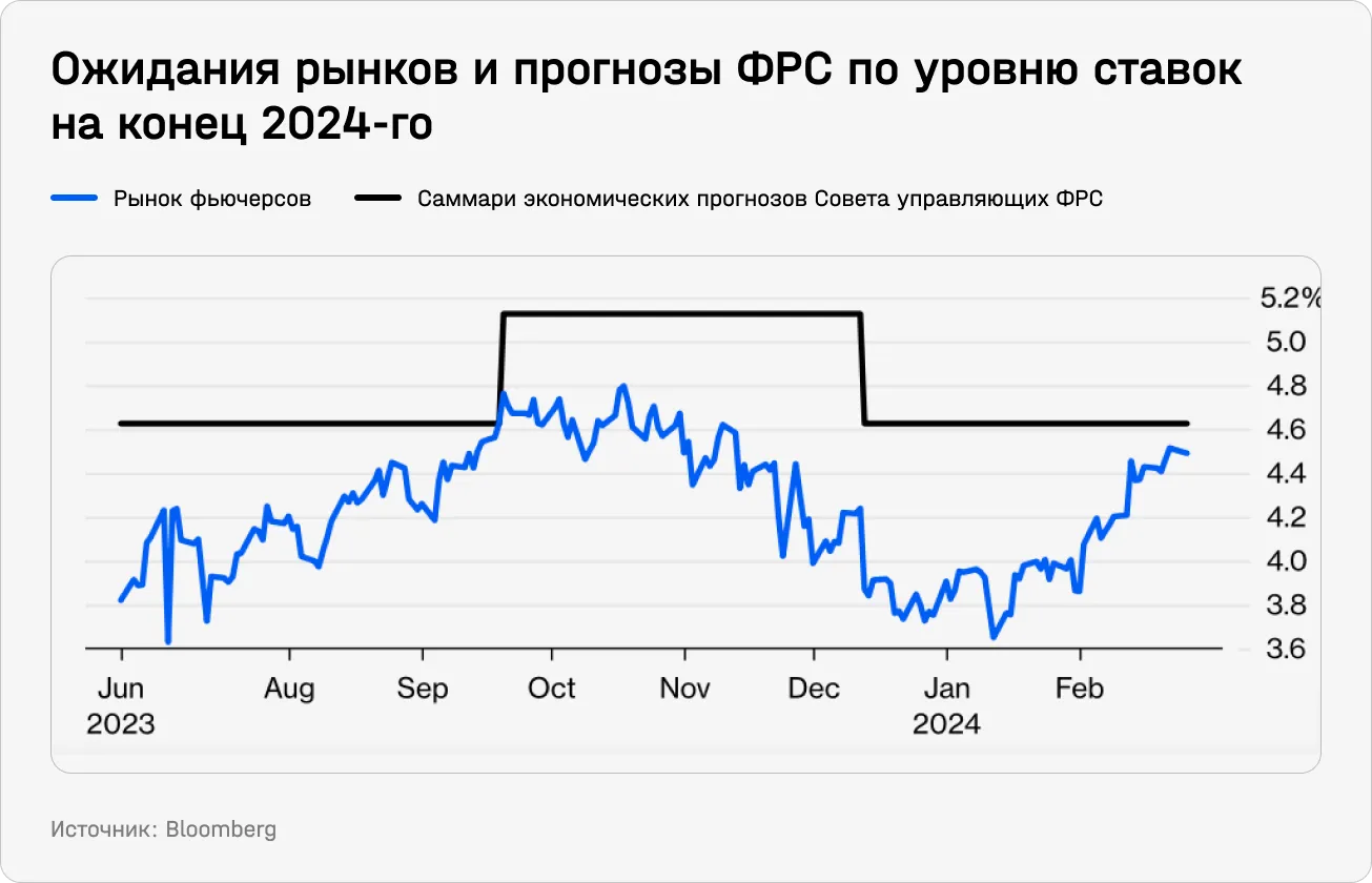 Рынки уже капитулировали перед ФРС: если в какой-то момент они ожидали шесть снижений ставок в 2024-м (на 150 б. п.), то теперь эти ожидания уменьшились до 3 шагов (80 б. п.). Это уже очень близко к медианному прогнозу чиновников ФРС (75 б. п.). Кроме того, ожидания первого снижения сместились с марта на июнь.