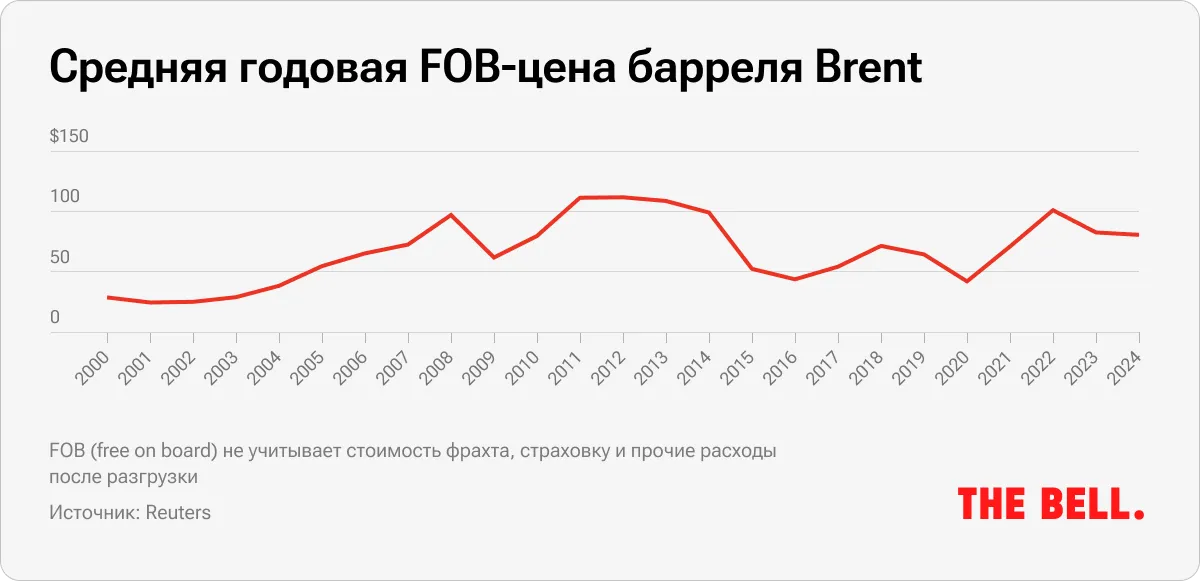 Почти все время нахождения у власти Владимиру Путину очень везло с ценами на нефть. Непрерывный рост начался в 2001 году с отметки около $24 за баррель и продолжался до лета 2008-го, когда стоимость нефти едва не пробила рекордные за всю историю $150. Через несколько месяцев, сразу после банкротства Lehman Brothers, нефтяные котировки рухнули ниже $50. Но ждать отскока после мирового финансового кризиса пришлось недолго — три года до вторжения России в Крым мировая экономика жила при трехзначных ценах на нефть. А следующее глубокое падение пришлось только на 2020-й, когда весь мир ушел на карантин из-за коронавируса.