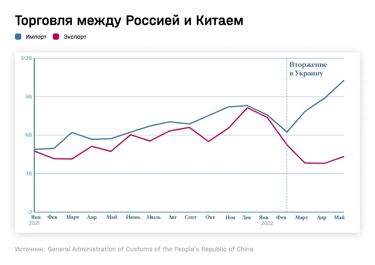 Изменения в экономических отношениях России и Китая после войны лучше всего иллюстрирует динамика торговли между странами: экспорт из России в Китай в первом полугодии 2022 года вырос на 48% (прежде всего за счет энергоресурсов), а импорт из Китая в Россию (прежде всего электроника и продукция машиностроения) — всего на 2,1%. Цифры по военным месяцам еще нагляднее: в июне это рост на 80% и падение на 17% соответственно.