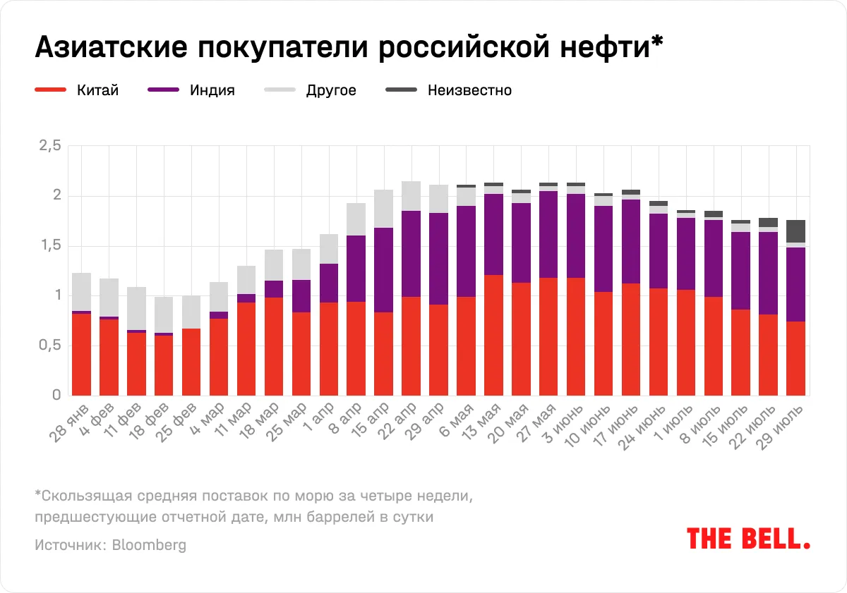 Поставки в Китай, если сравнивать те же даты, не просто не выросли, а упали. В январе (Bloomberg приводит скользящую среднюю ежедневных отгрузок из российских портов в адрес разных стран-покупателей за четыре недели) Россия продавала в Китай 820 тысяч баррелей нефти в сутки. В июле — 740 тысяч б/c.